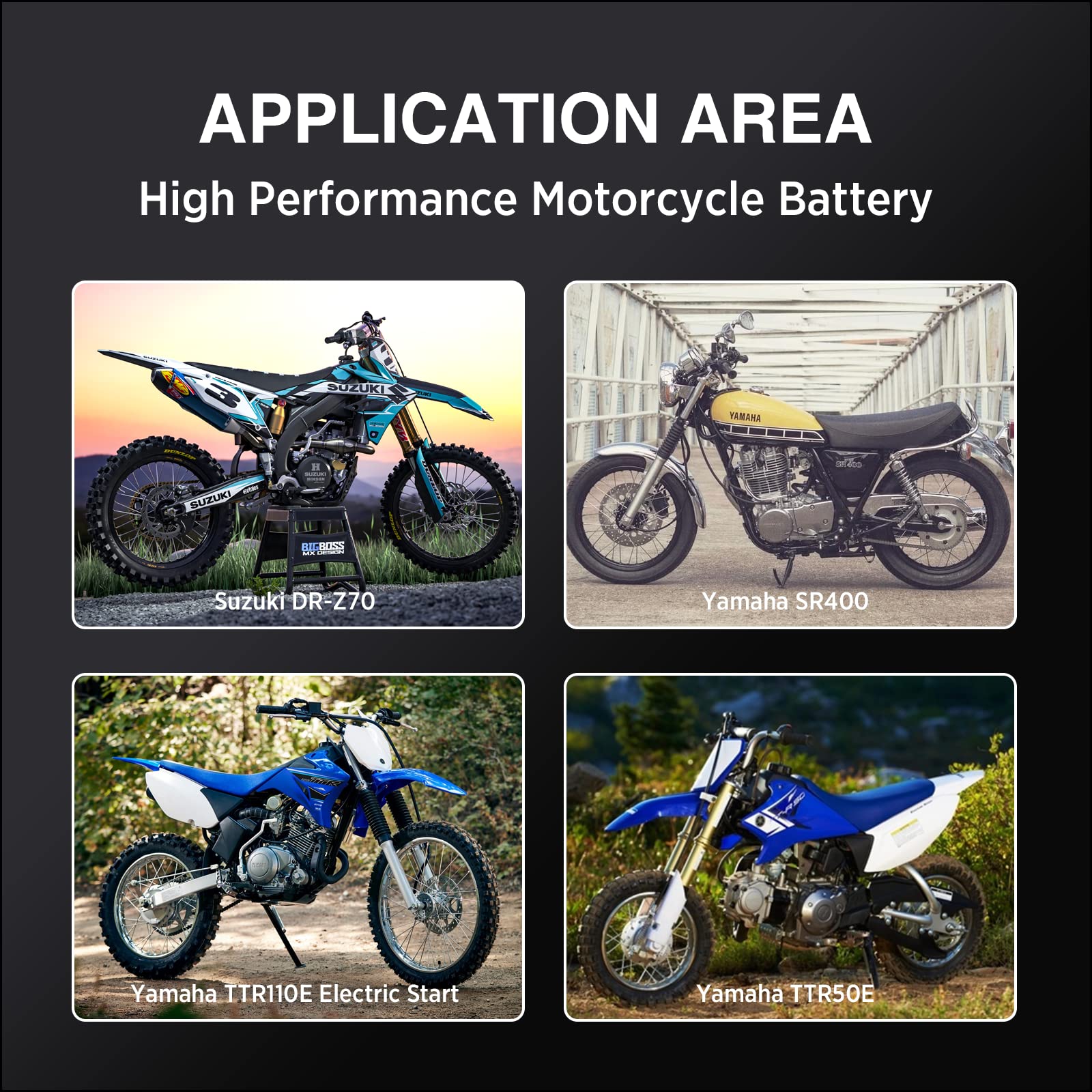 FIT for Yamaha: 2015 - 2017 Years 400cc SR400; 2008 - 2018 Years 110CC TTR110E Electric Start; 2006 - 2018 Years 50cc TTR50E; 2003 - 2007 Years 90cc TTR90E Electric Start; Yamaha Vino 50;