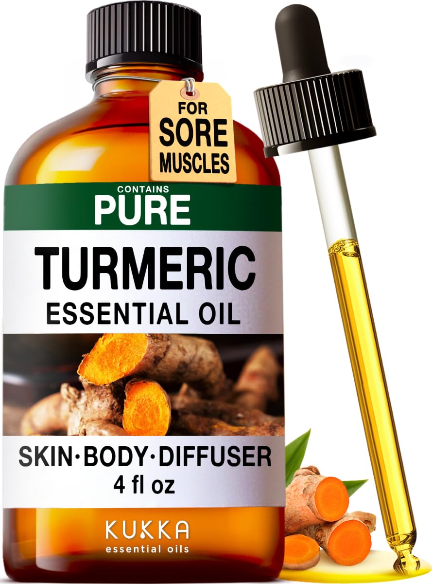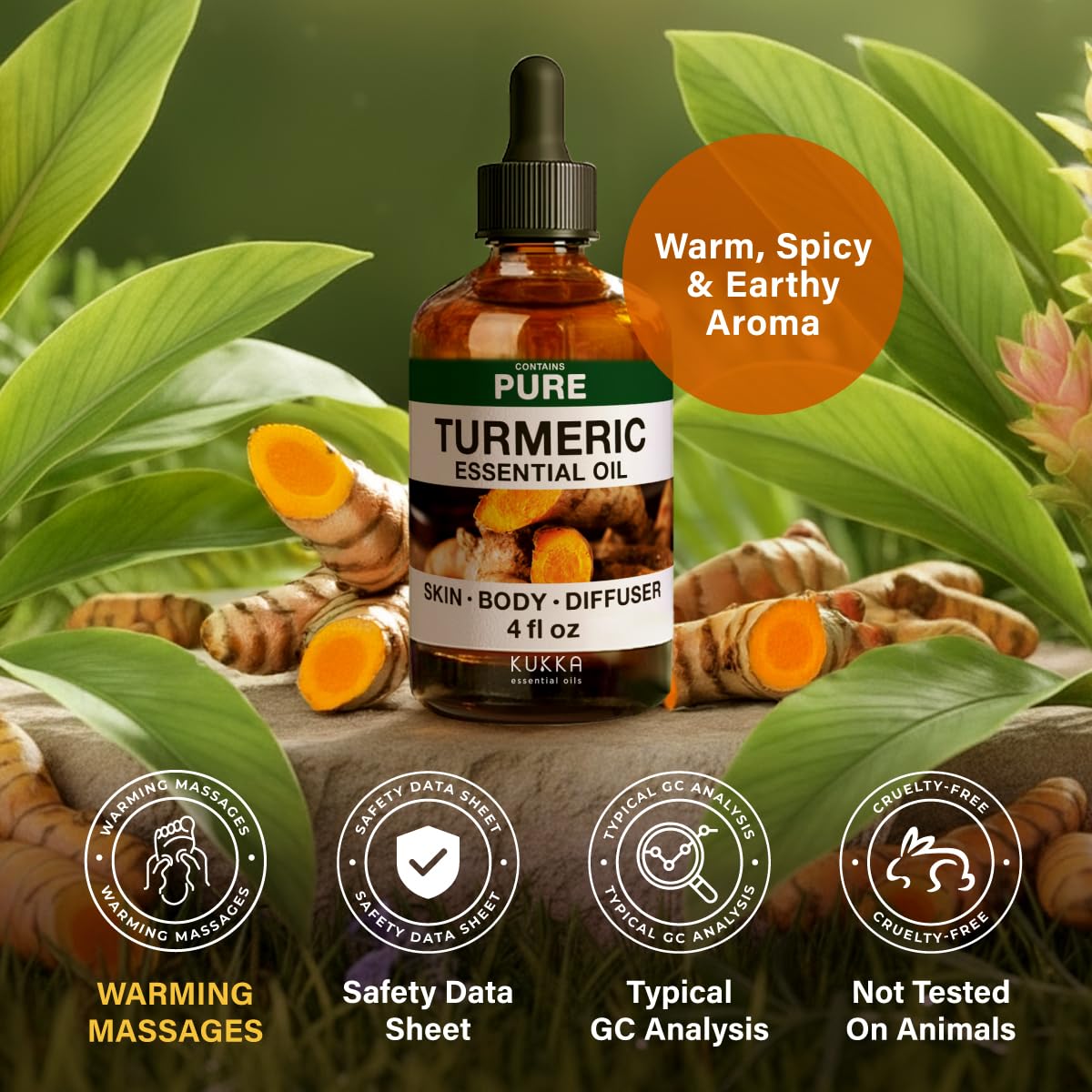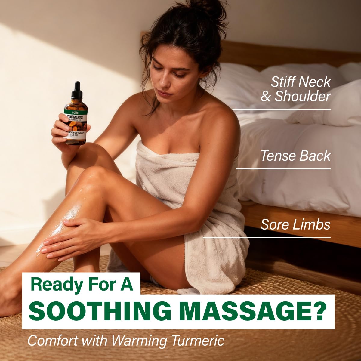 Soothing for tired bodies. Turmeric oil may embrace overworked bodies with a warming effect, which may be helpful after post-workout or a long day at work. Mix 2-3 drops with carrier oil and massage on tender areas to use as a massage oil.