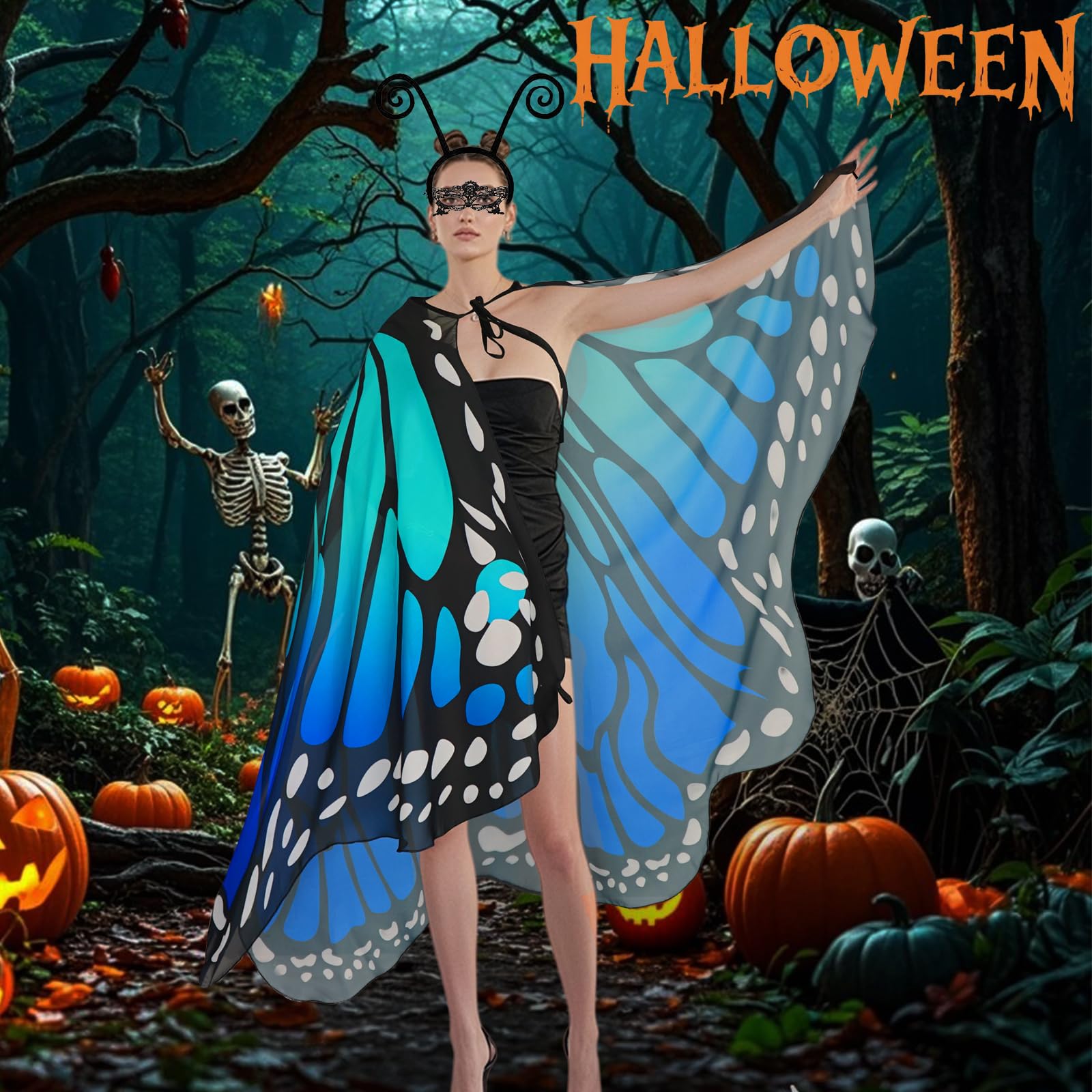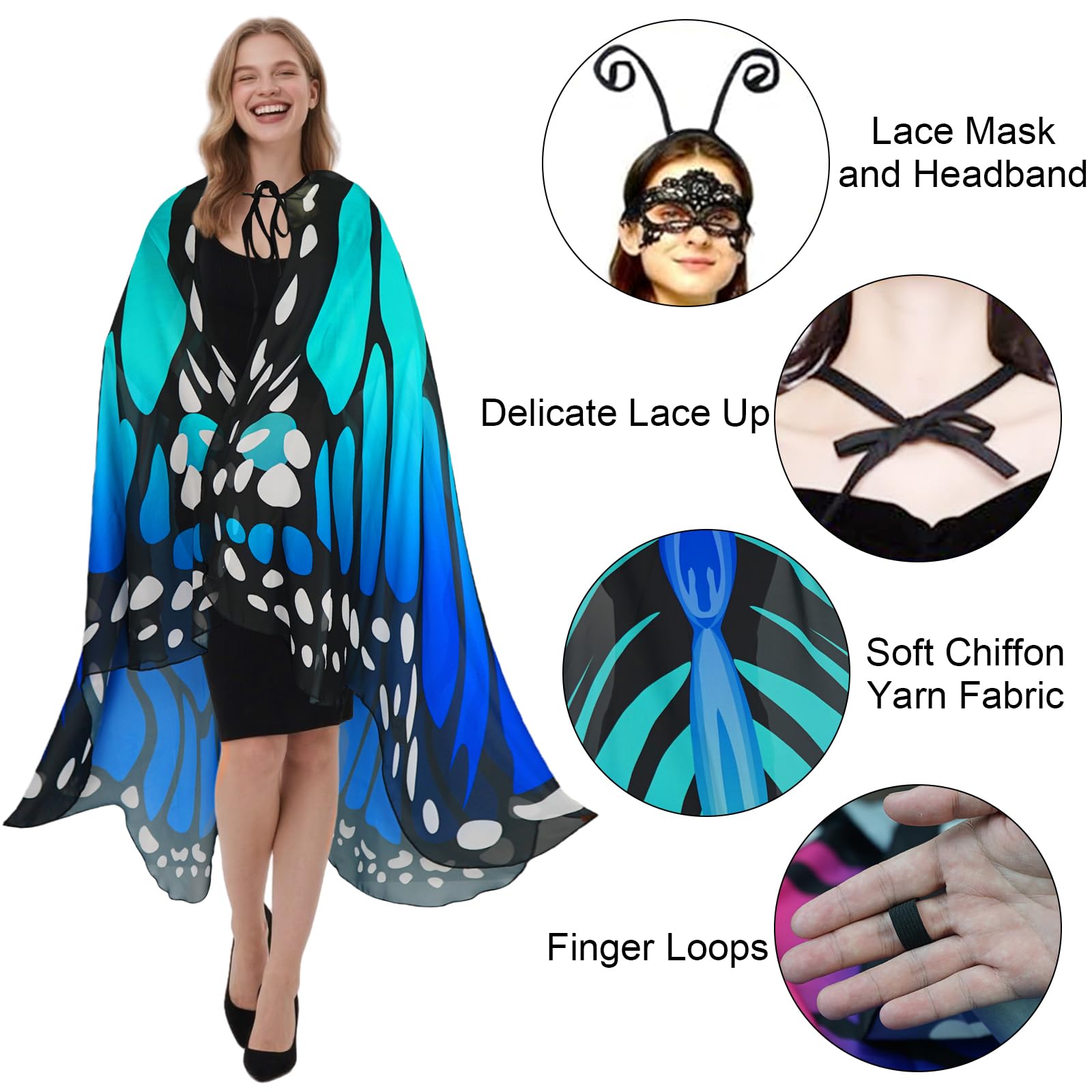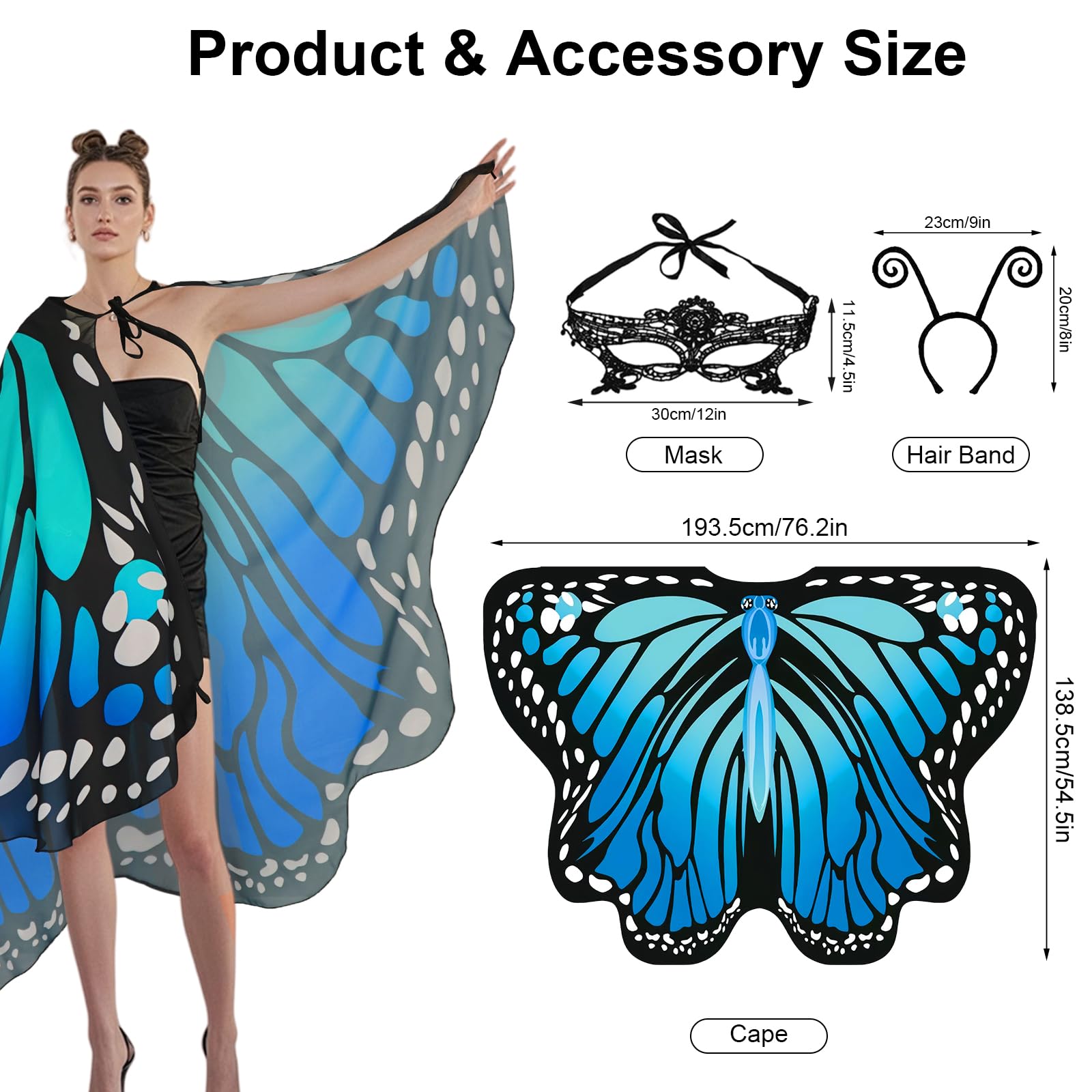 🦋 Complete Butterfly Costume Set for Adults – This stunning butterfly costume for women includes a chiffon wings cape (198x140 cm/78x55 inches),a delicate lace mask,and a antenna hairband.The adjustable neck drawstring and finger loops ensure a secure,comfortable fit,making it ideal for adult Halloween costumes for women and cosplay events.