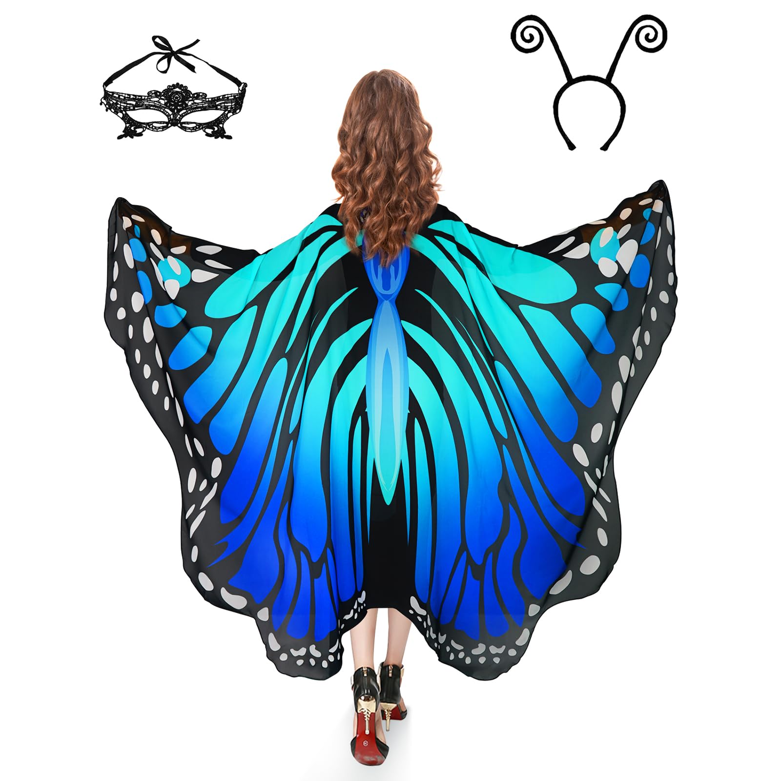 Description Halloween Women’s Set: 1 x Innovatively designed butterfly double-layer wings shawl, 1 x antennae headband and 1 x lace mask make you look even more mysterious and charming at the party! Material: The butterfly costume is made of high-quality light chiffon fabric that will not fade; the tentacle headband is made of velvet and plastic, which is strong and does not break easily; the mask is made of lace and soft to the skin. Suitable sizes: Butterfly wing shawl is about 78*55 inches, butterfly cloak is larger, and may not be suitable for children under 15 years old, tentacle headband height is about 30 cm/11.81 inches, lace mask size is about 12*4.5 inches Widely applicable to all occasions: Butterfly wings costumes are a great decoration for Halloween costumes, parties and beach decorations, and are also thoughtful gifts for mothers, lovers, family and friends. Light up your party: These butterfly costumes are designed in the shape of butterfly,which are cute and fun, and you can wear them on different occasions such as Halloween, Christmas, parties, carnivals, and show your vitality .