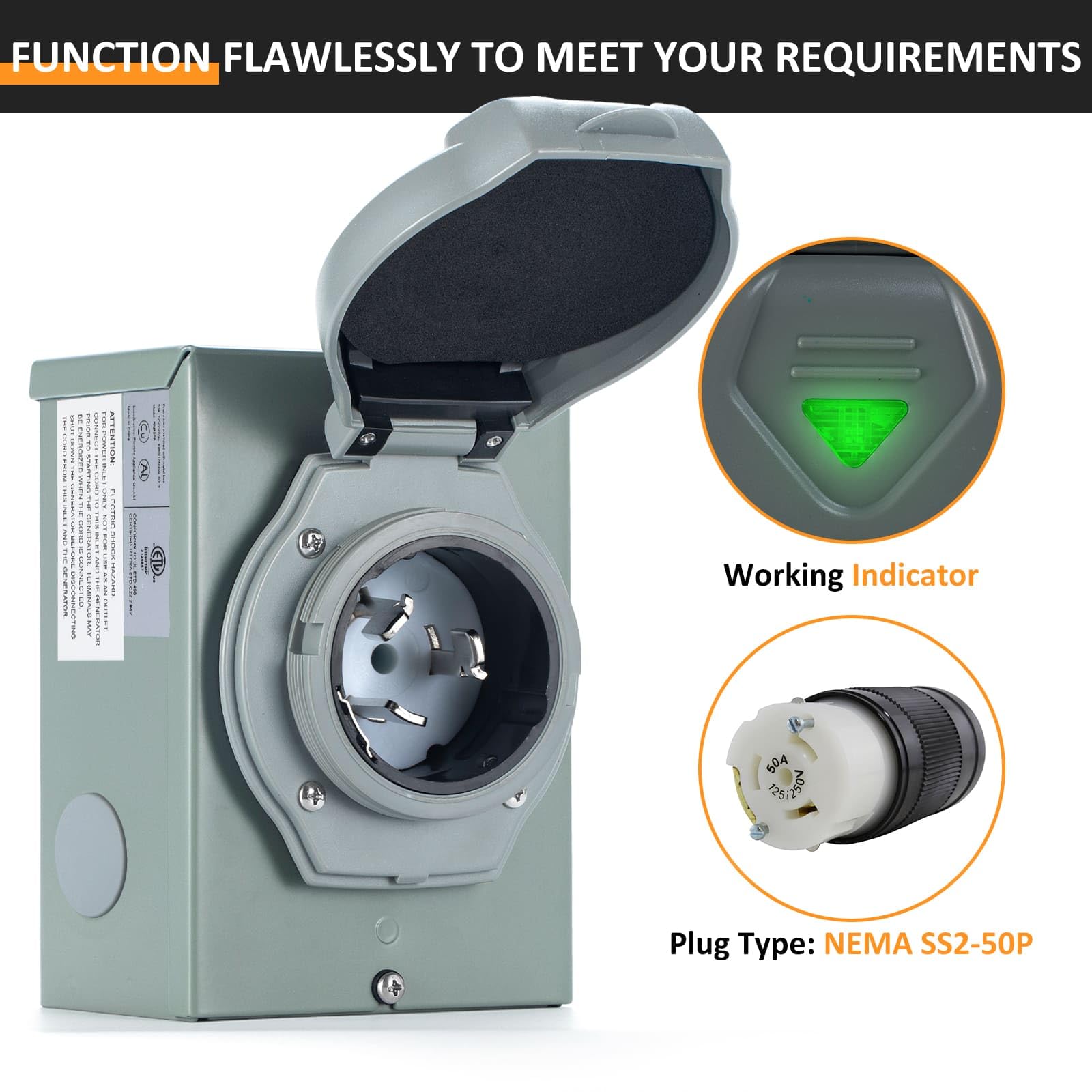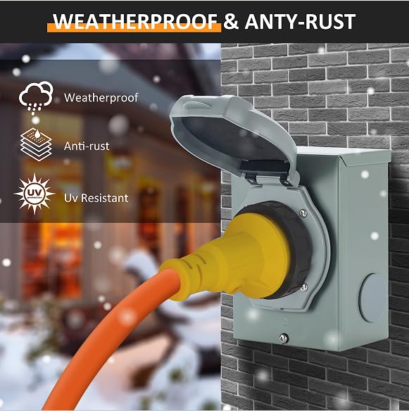 Durable and Weatherproof: Constructed from high-quality steel with a weatherproof, anti-corrosive powder-coat finish, this generator outlet box 50 amp is designed to endure the harshest outdoor conditions. The flip cover protects the inlet from moisture when it is not in use.