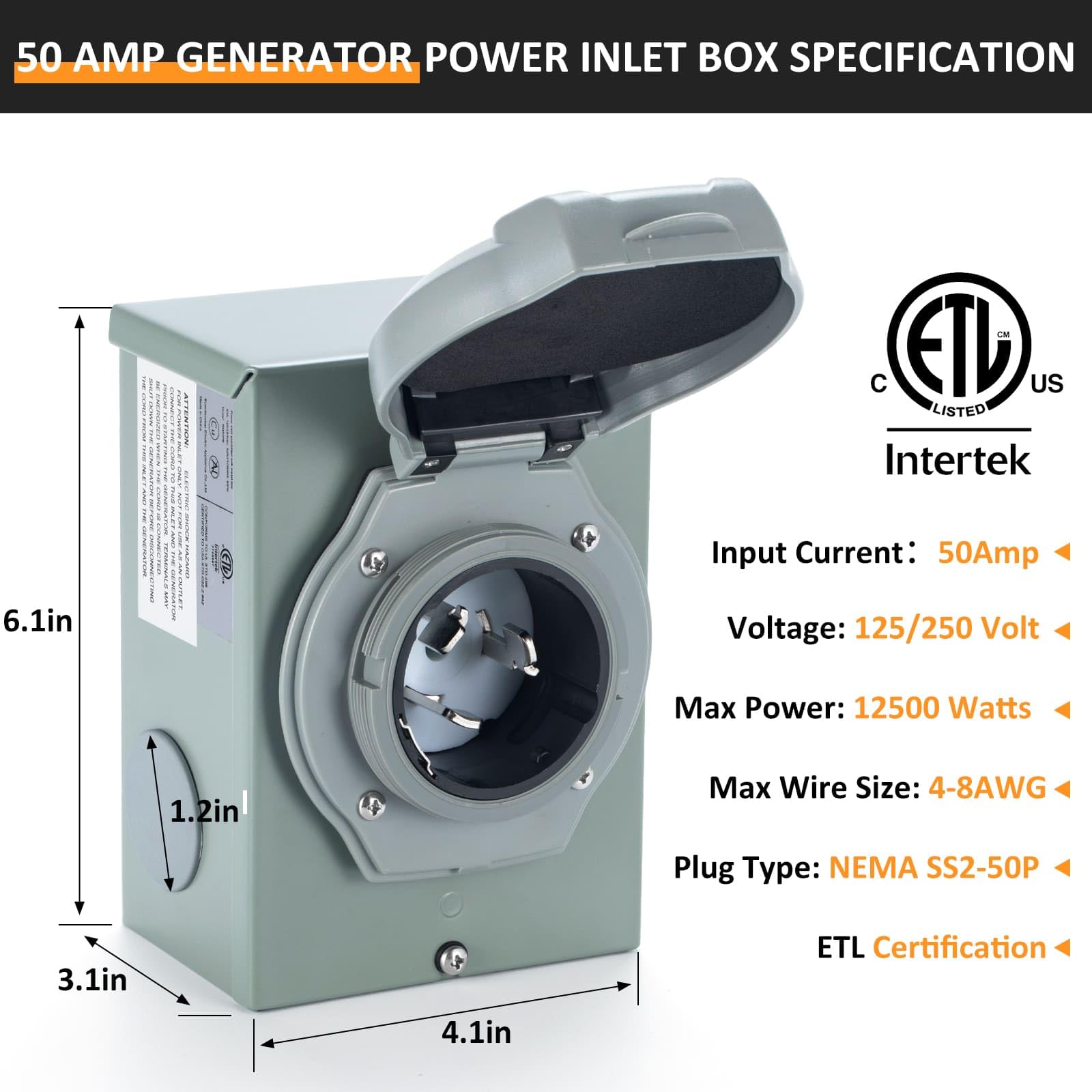ETL Certified Safety: With ETL certification for 125/250V and 6250/12500W, this 50amp generator inlet box is built to meet the highest standards for use with transfer switches or generator-ready panels and is designed for outdoor installations to help mitigate carbon monoxide risks.
