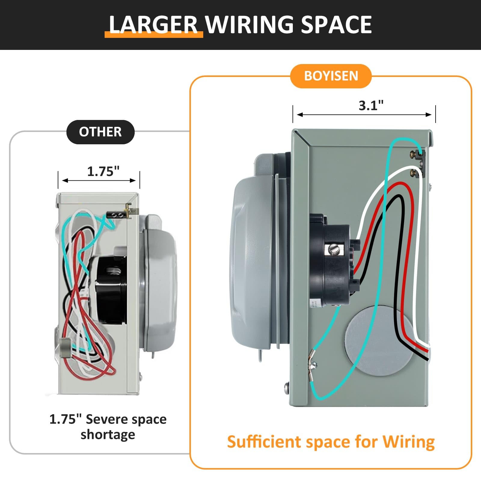 Spacious Design: Boasting 50% more internal space than standard models, this 50a generator inlet box provides ample room for easy wire management. The removable front panel allows for straightforward installation and future maintenance.