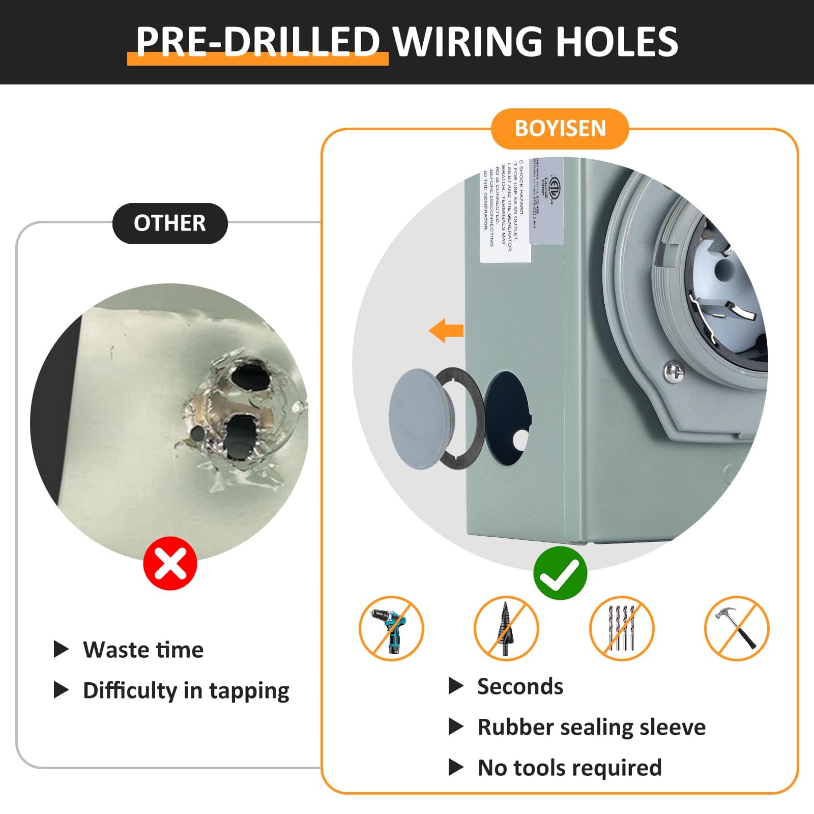 Easy Installation: Featuring a pre-drilled design, this 50 amp generator inlet box allows you to quickly and easily remove or replace wiring caps without the need for special tools, drills, or an electrician, thus saving time and money.