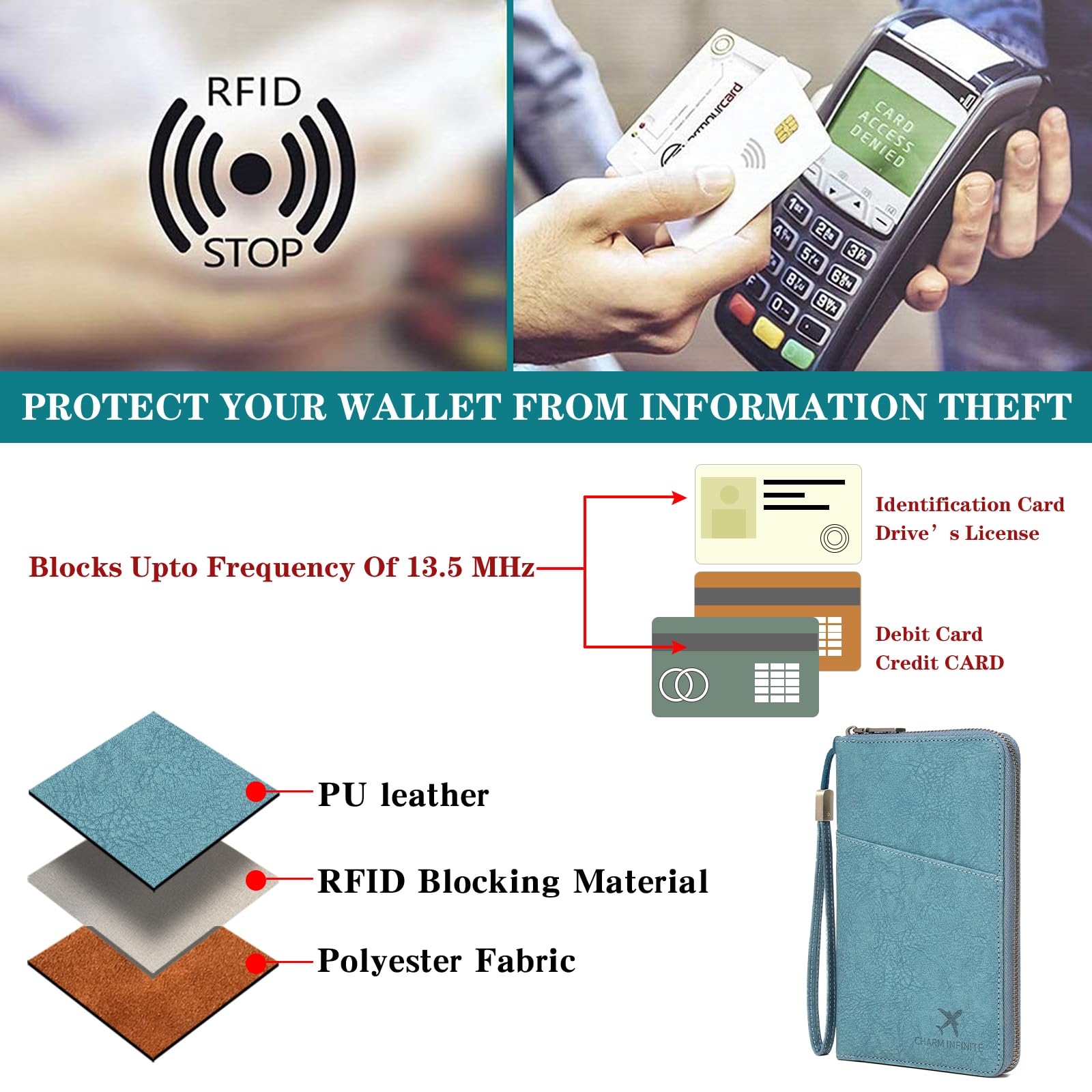 RFID Security: The leather passport holder rfid blocking has a special material to block RFID signals so that the passport organizer can protect your personal information in your passport and credit cards from unauthorized scans. RFID blocking shielding material of the passport holder men women is used to prevent thieves from swiping your credit card to steal your personal information in airports or crowded places