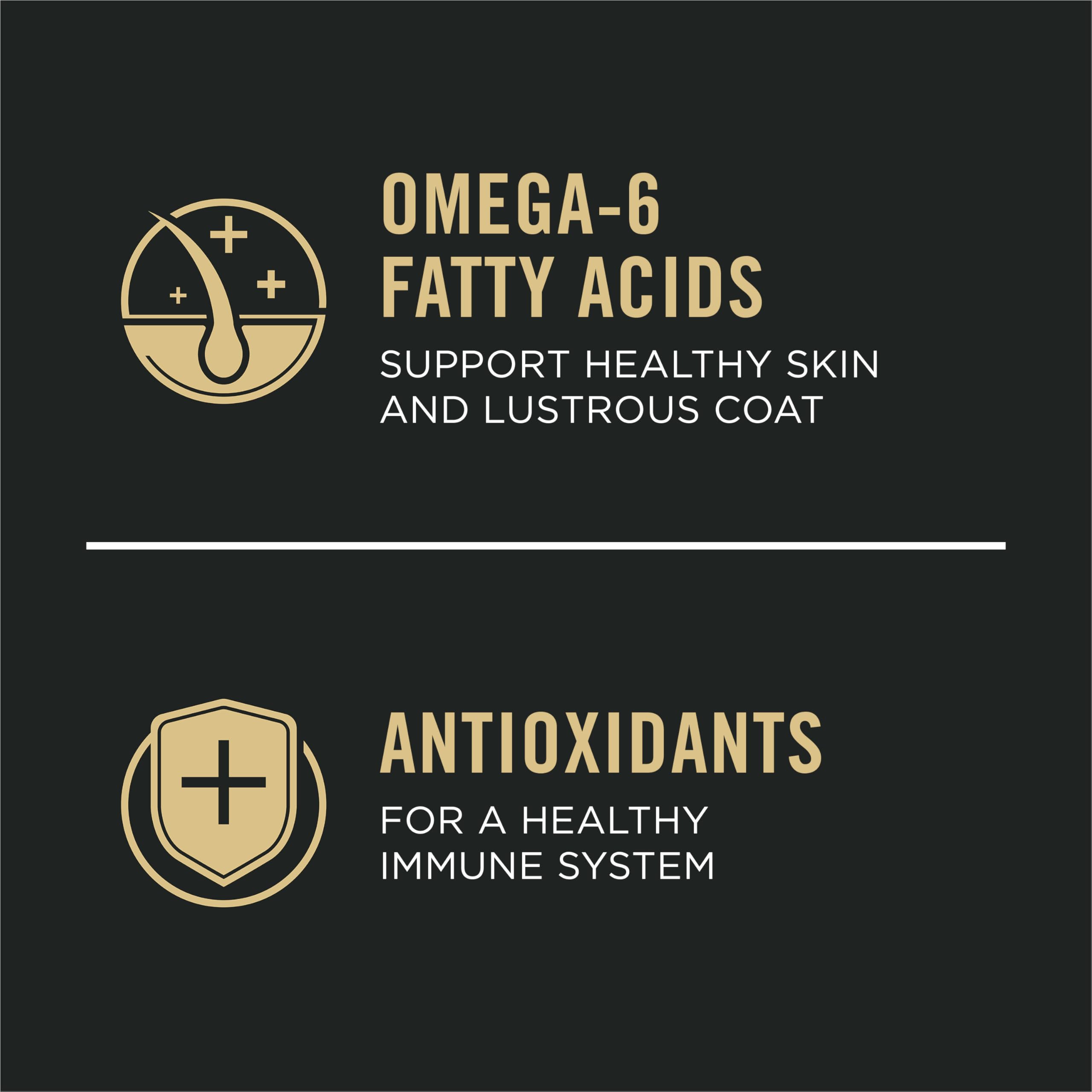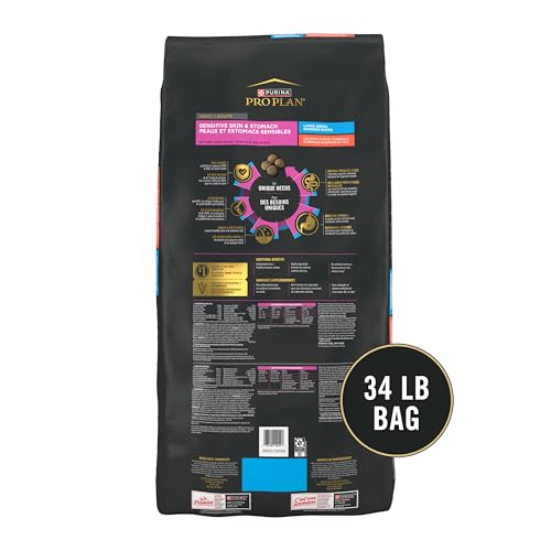 Choose nutrition that performs when you support your dog's health with Purina Pro Plan Large Breed Sensitive Skin and Stomach Salmon and Rice adult dry dog food. With real salmon as the first ingredient, this high protein dog food delivers a savory flavor. Oat meal is gentle on his digestive system, while antioxidants help support a healthy immune system. Our premium large breed dog food also includes glucosamine and EPA, an omega-3 fatty acid, for joint health and mobility. Sunflower oil, a rich source of omega-6 fatty acids, supports his skin and coat. We fortify this sensitive stomach dog food with guaranteed live probiotics for digestive and immune health and include natural prebiotic fiber to nourish specific intestinal bacteria. It's wheat and soy free and made without artificial colors or flavors to meet your preferences. Deliver 100 percent complete and balanced nutrition to your large adult dog with Purina Pro Plan Large Breed Sensitive Skin and Stomach Salmon and Rice adult dry dog food.