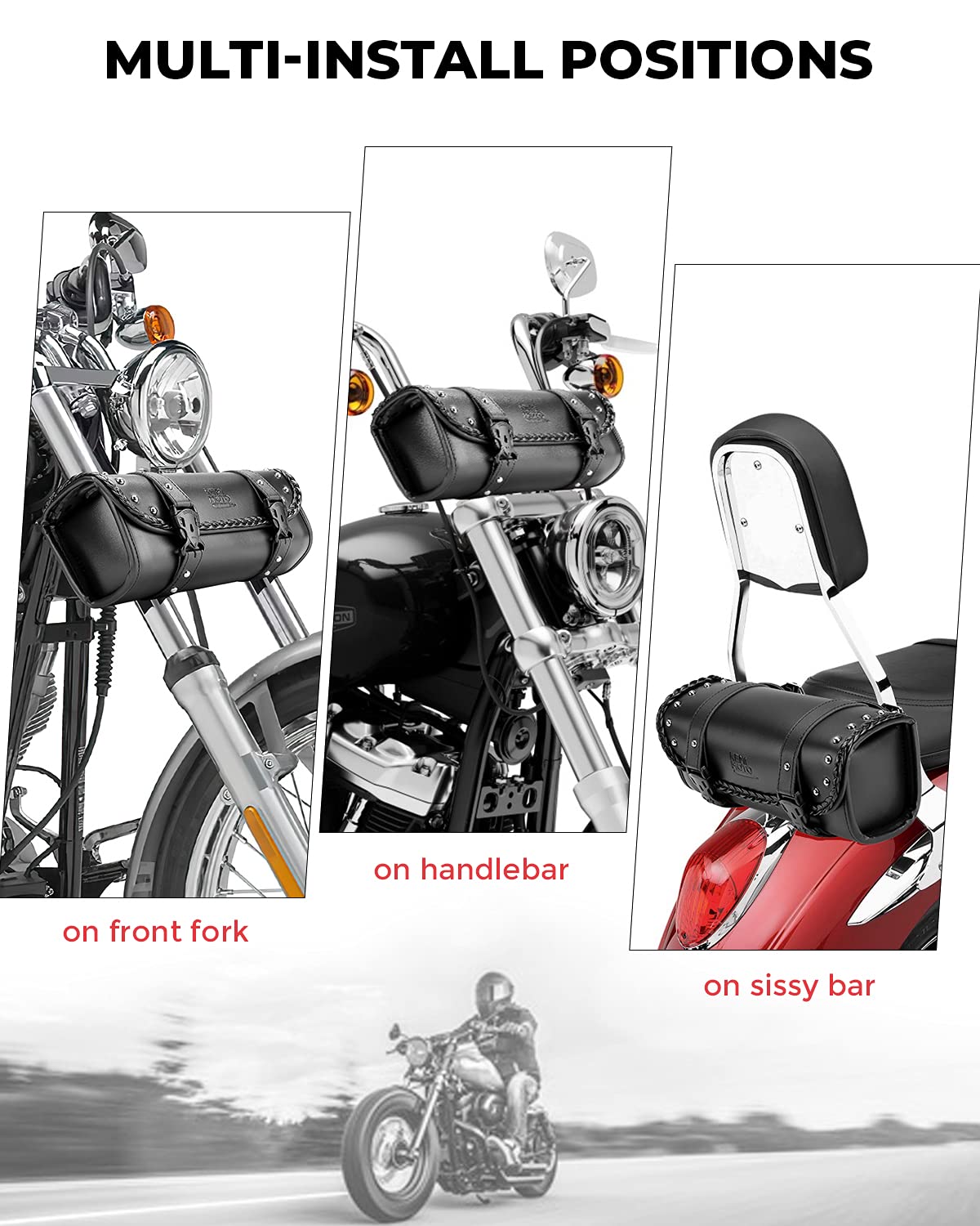 【Versatile Mounting】Our motorcycle fork bag includes 2 adjustable mounting straps and 4 cable zip ties, allowing for easy installation on your handlebars, sissy bar, front forks, and side frame. Compatible with most types of bikes and motorbikes.