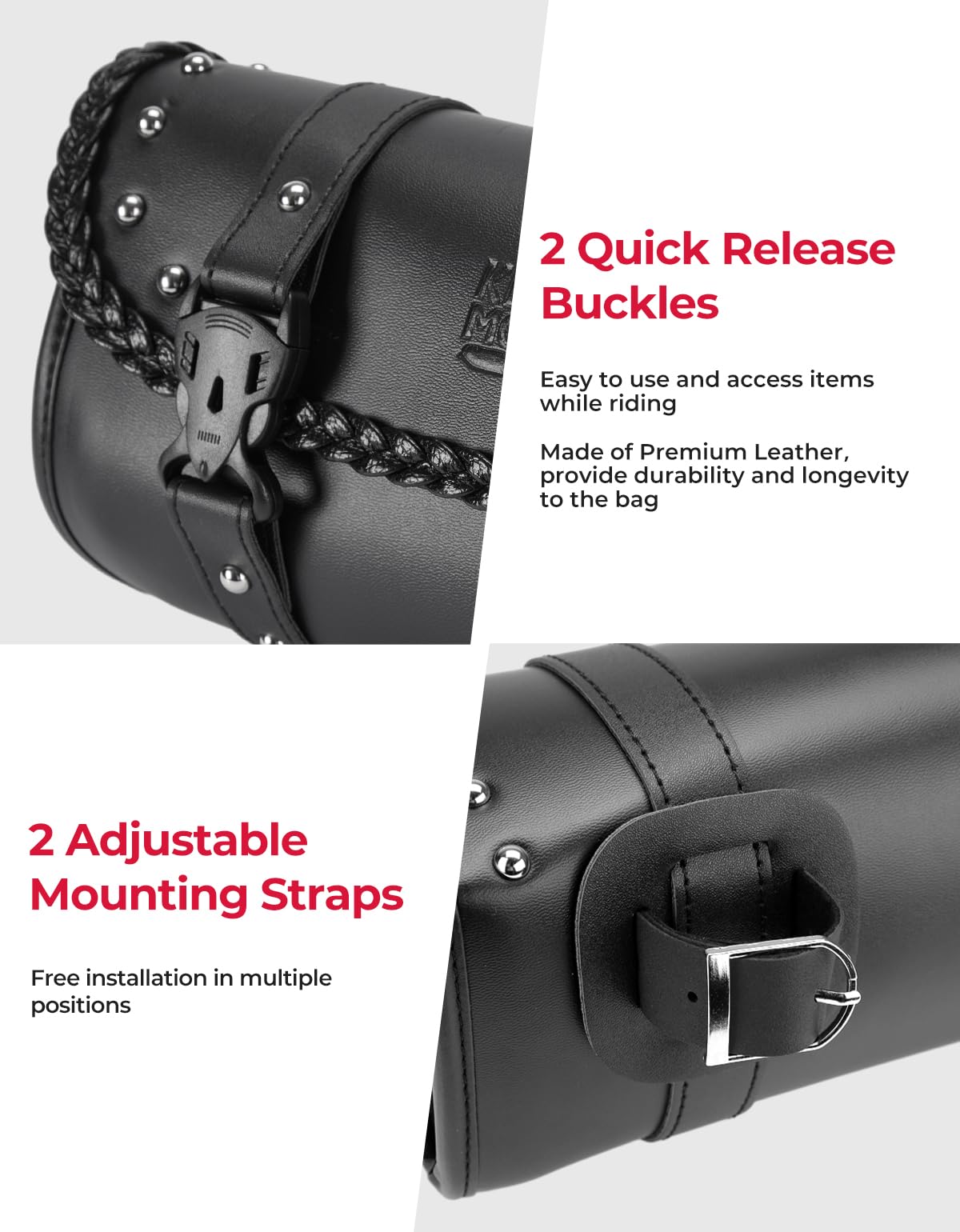 【Convenient Access】Featuring 2 Quick Release plastic buckles, this motorcycle tool bag allows for effortless one-handed access to your items. The adjustable and removable back straps ensure maximum comfort and convenience.
