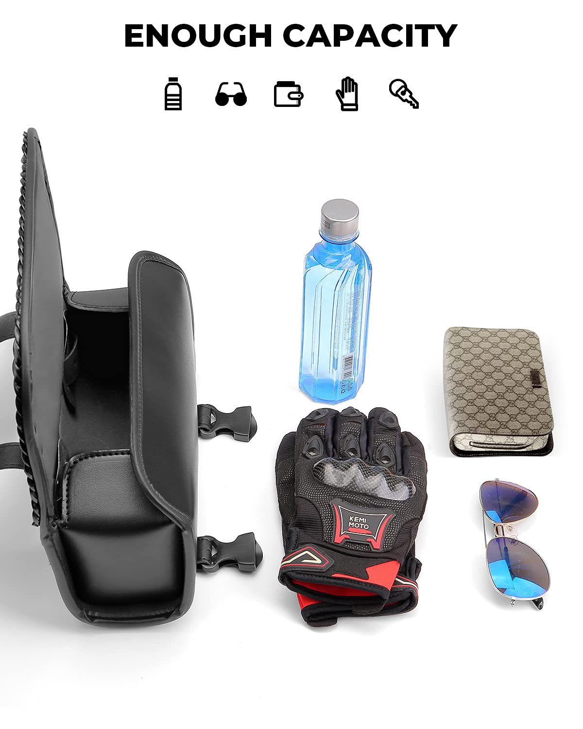 【Enough Capacity】This premium leather motorcycle handlebar bag boasts superior stitching and heavy-duty buckles, with a spacious size of 11.4*4.7*4.1 inches. Perfect for carrying all your essential items, including keys, sunglasses, wallet, driver's license, and cell phone.