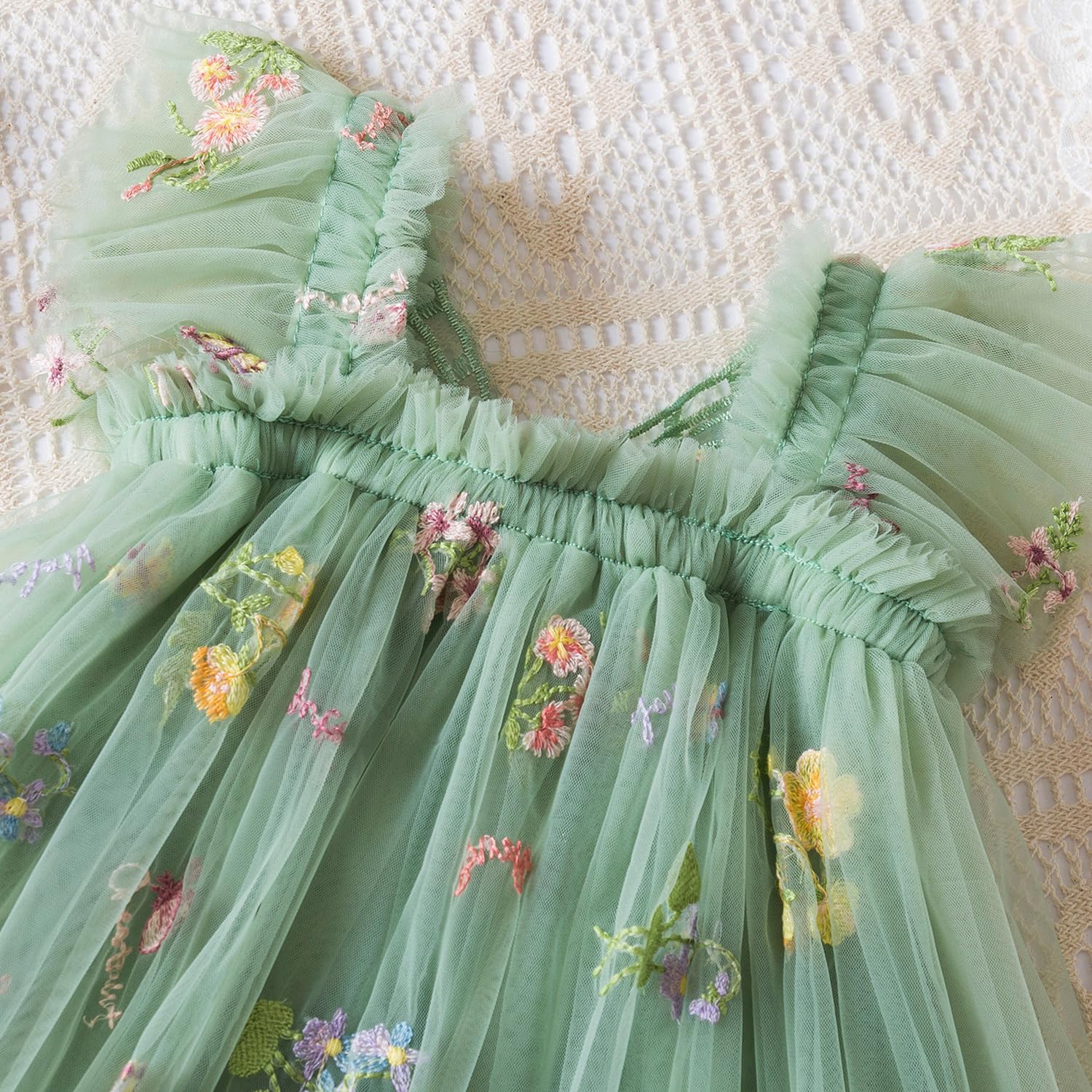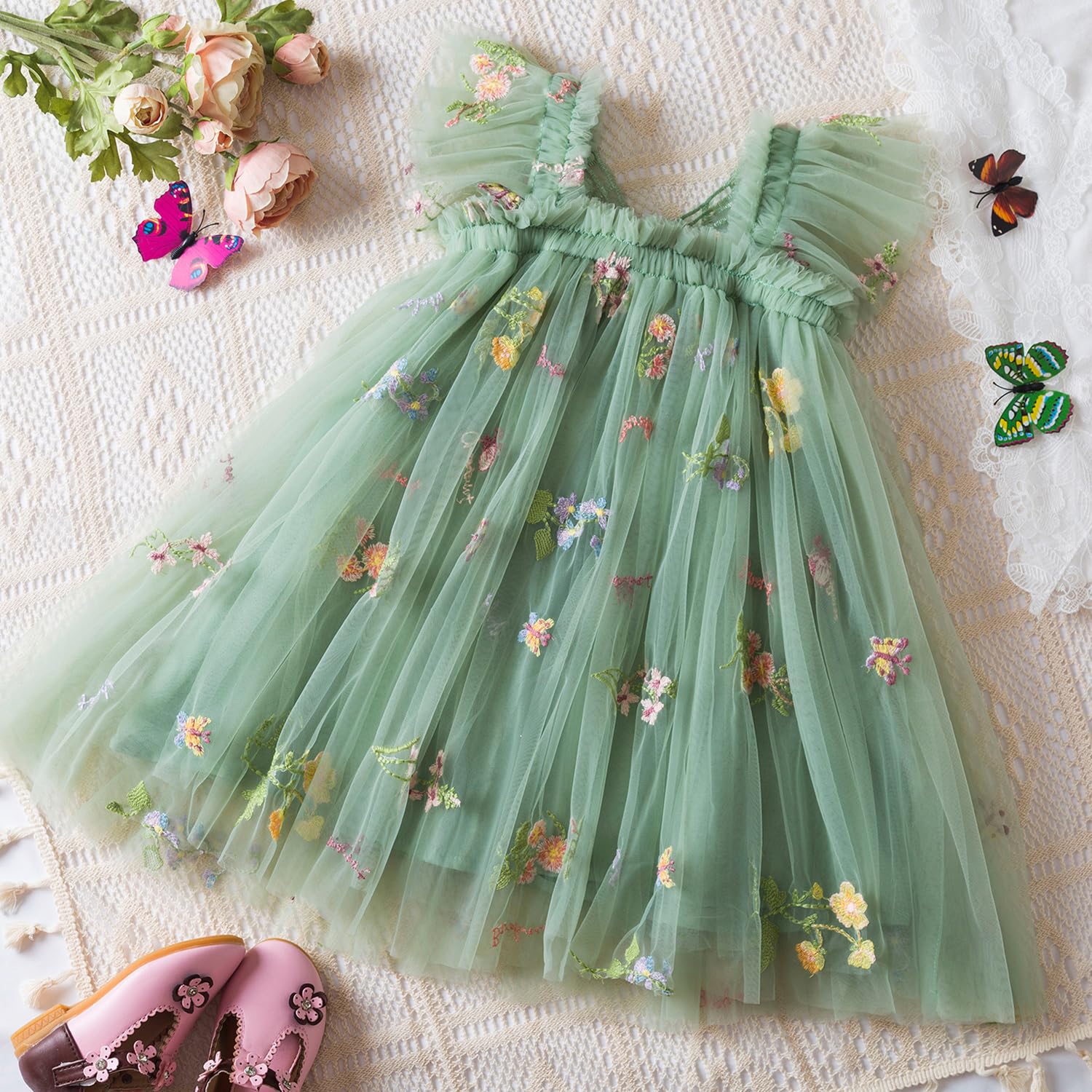 Charming Floral Embroidery: This adorable summer dress features delicate floral embroidery on soft chiffon, creating a sweet and elegant look for your little girl.