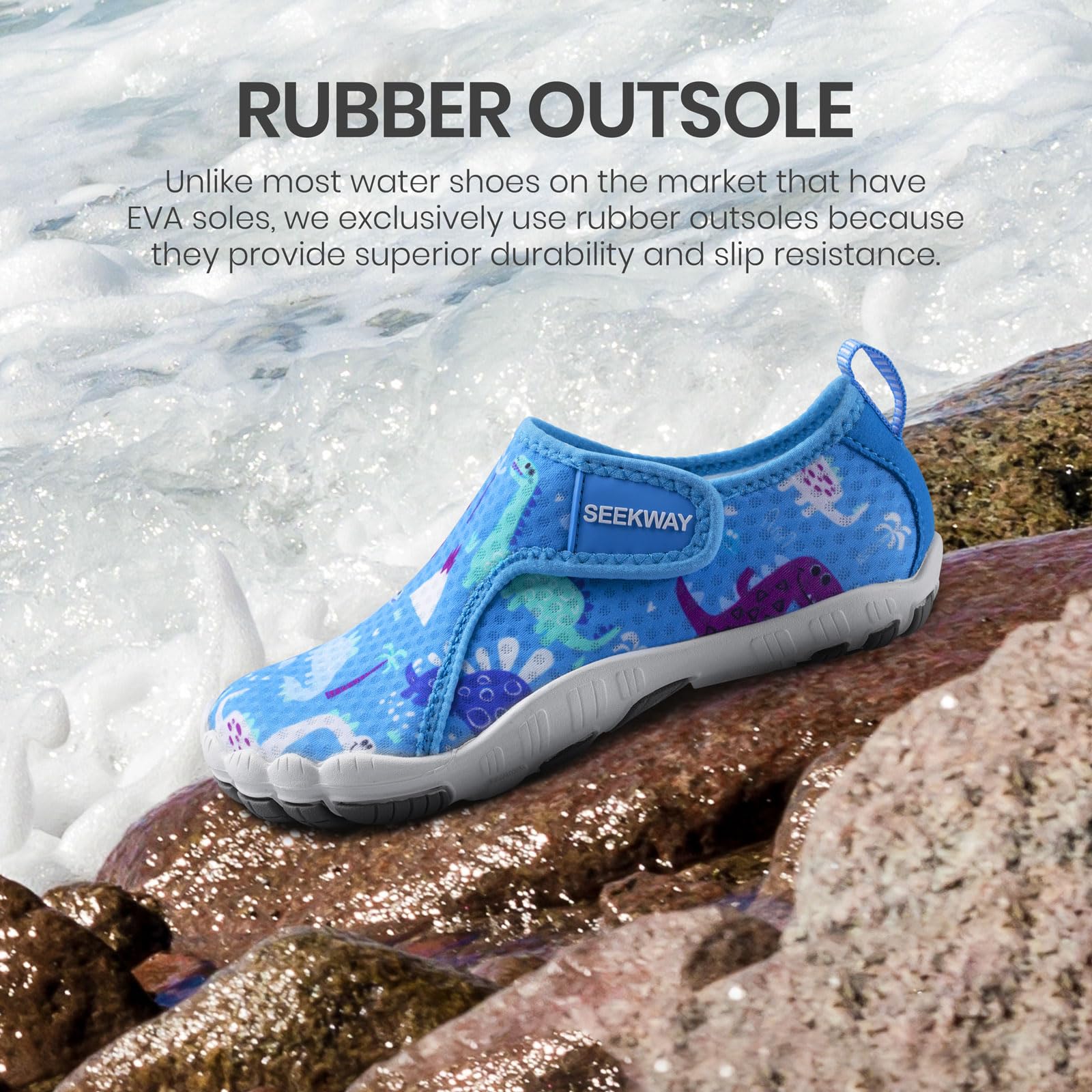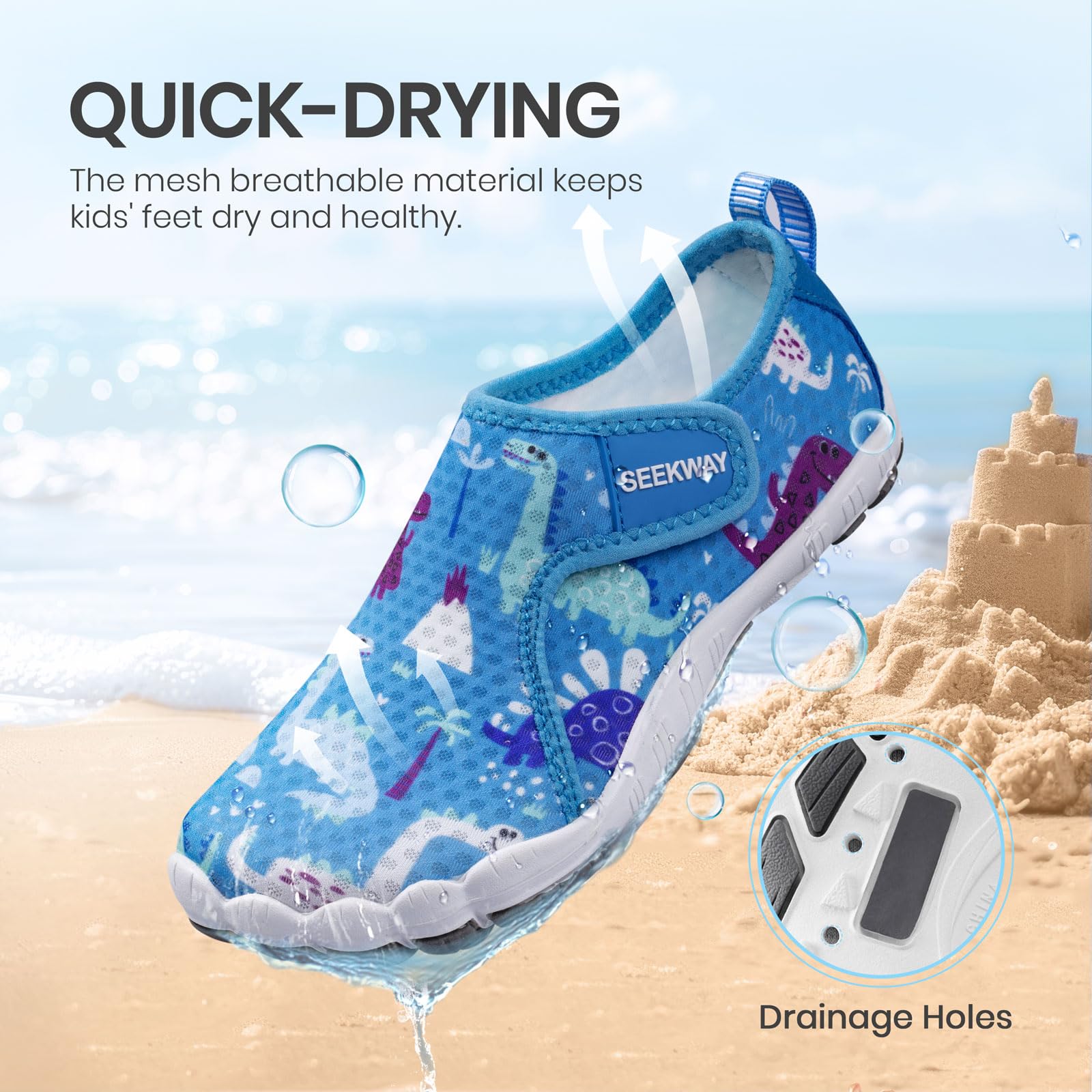 【Breathable & Permeable Material】: The mesh breathable material on the upper combined with drainage holes on the outsole keeps kids' feet dry and healthy.
