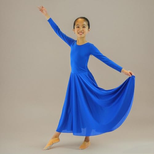Praise Dance Dress for Girls: This girls praise dance dress is designed with a full-length, flowing skirt and long sleeves, offering a graceful and modest look perfect for worship performances, church events, and recitals. The round neckline adds to its simplicity and elegance.