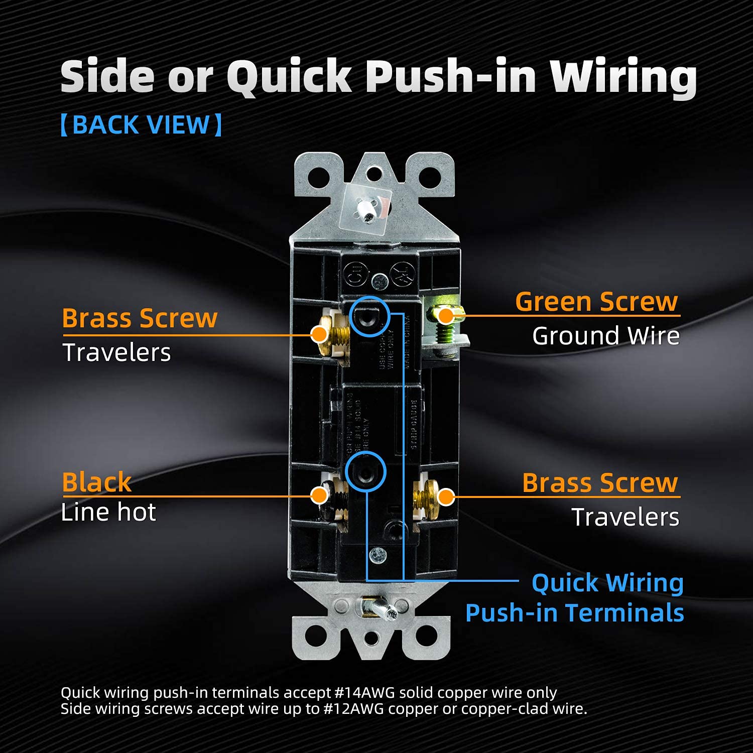 ✅【Easy Installation】Provide both quick push-in wiring and side wiring. Quick wiring push-in terminals accept #14AWG solid copper wire only. Side wiring terminal screws accept wire up to #12AWG copper or copper-clad wire. Break-off plaster ear for best flush alignment. Shallow body design fits standard junction boxes.
