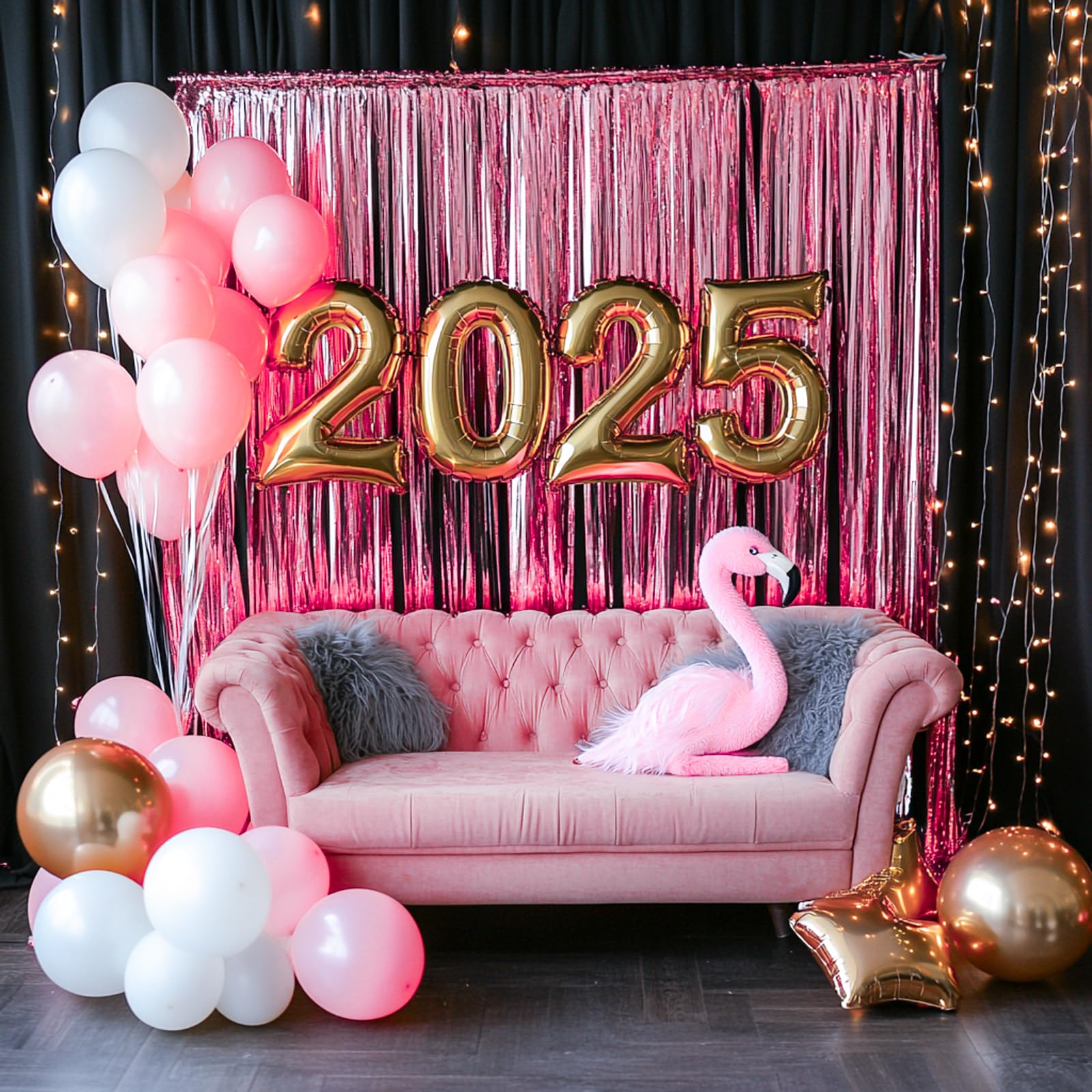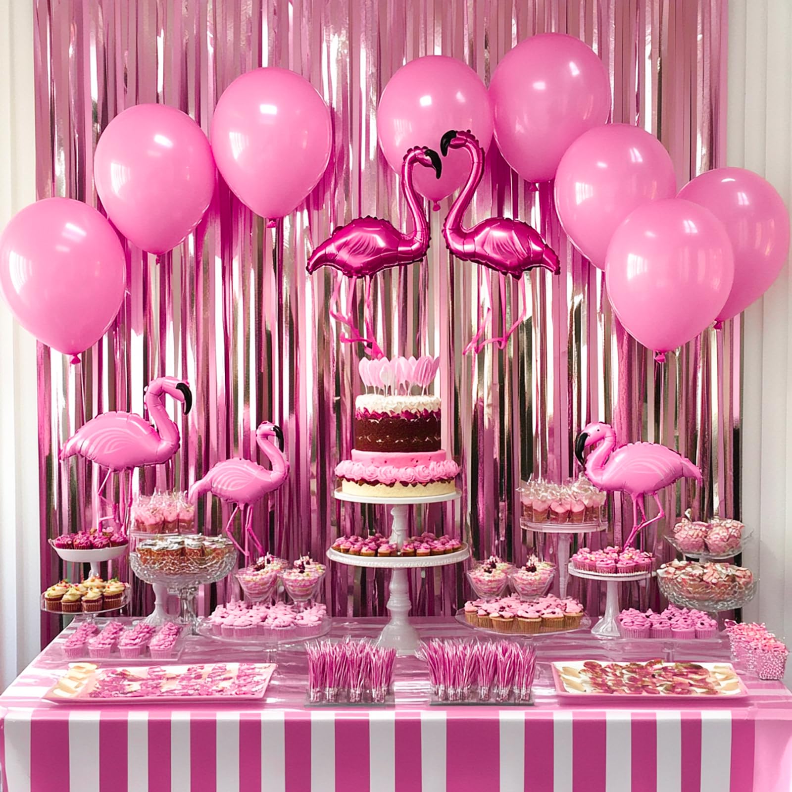 Celebration Scenes: Pink foil fringe for baby shower, bridal shower, and Valentine's Day, dessert tables with cake accents for gender reveals, princess themes, wedding and anniversary. Instagrammable selfie zone for event planner and DIY decorator