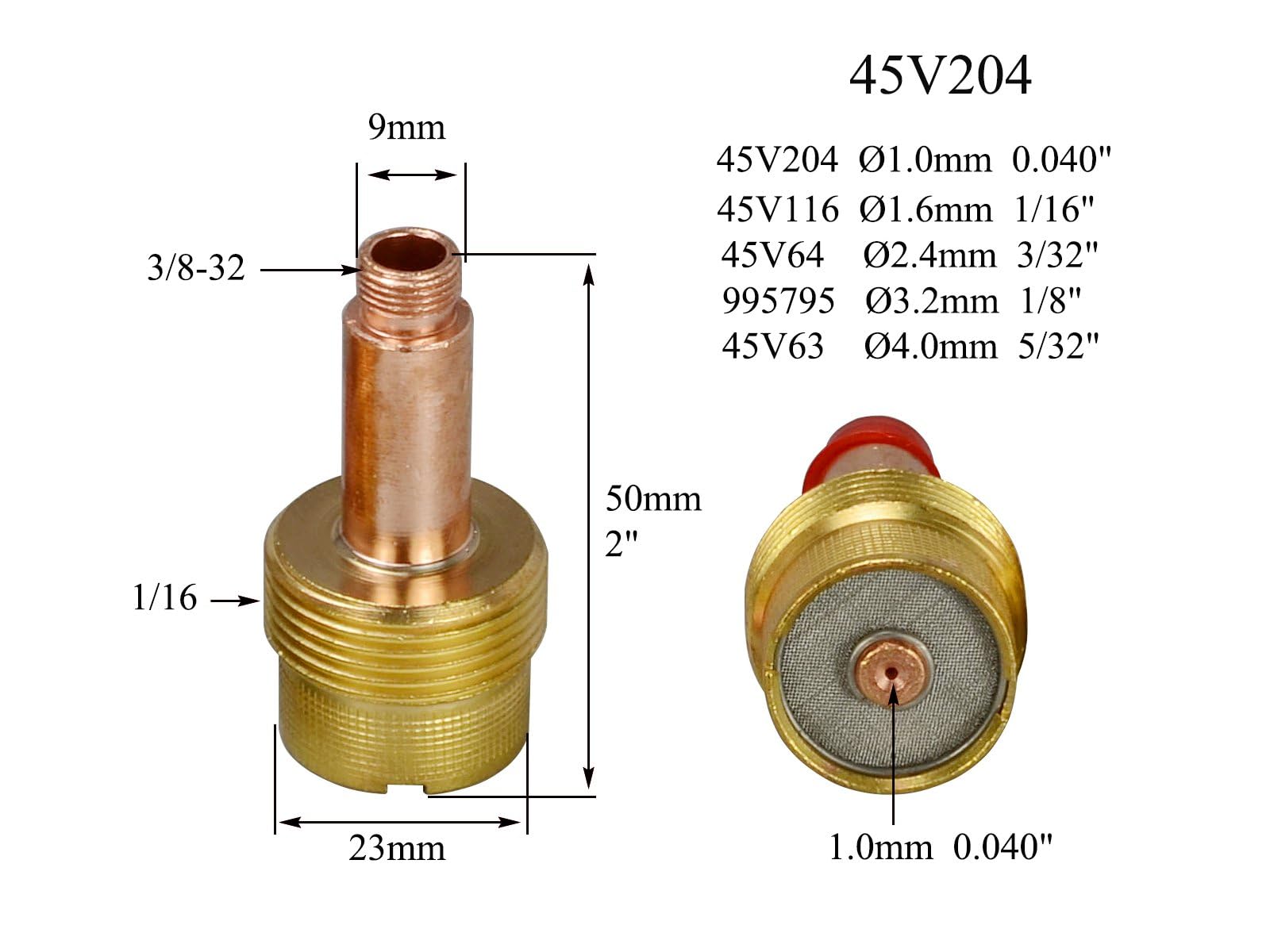 2pcs TIG Gas Lens Collet Bodies Ref No 45V204 ( .040“ & 1.00mm Orifice ) and Size: ( .040“ x 2" & 1.00mm x 50mm )