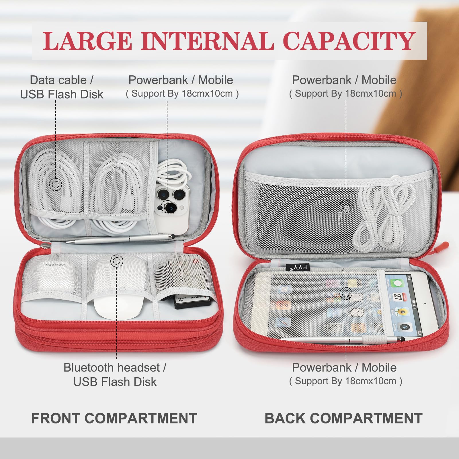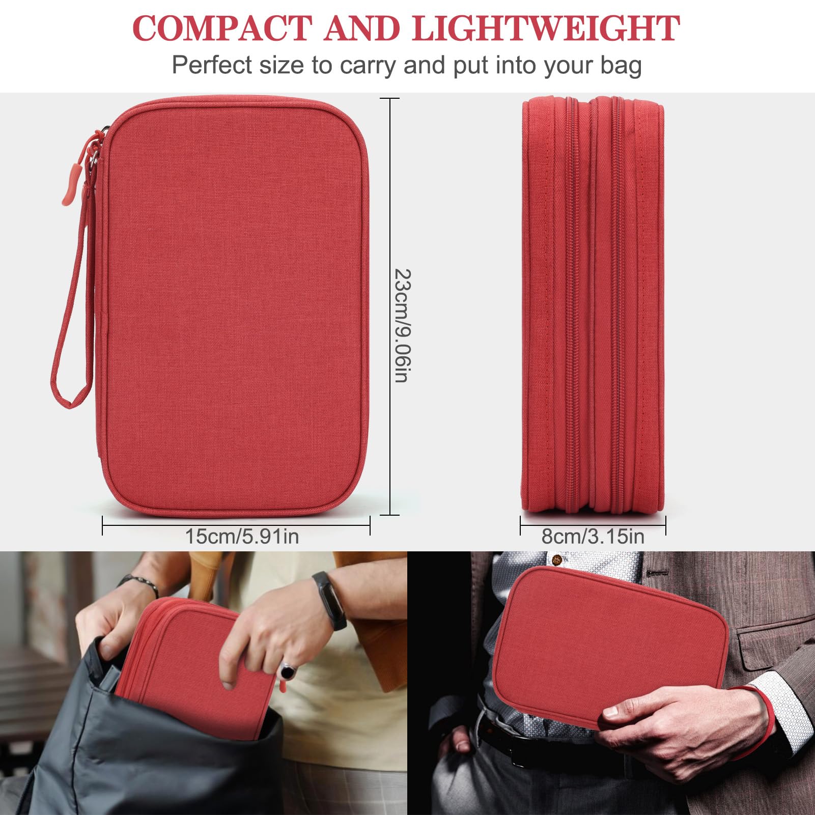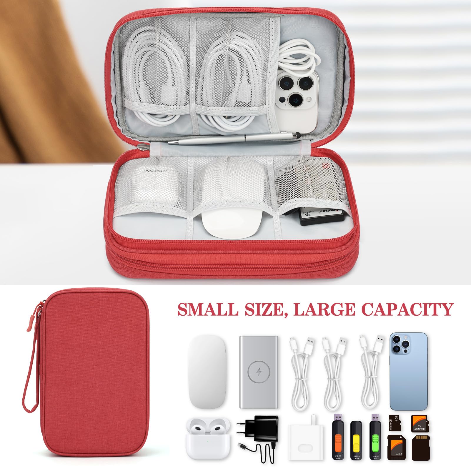 Double Layers Design: The electronics storage bag has 2 layers interior compartment with enough space to take in your cords, cables, USB drive, cellphone, charger, mouse, flash drive, and other accessories