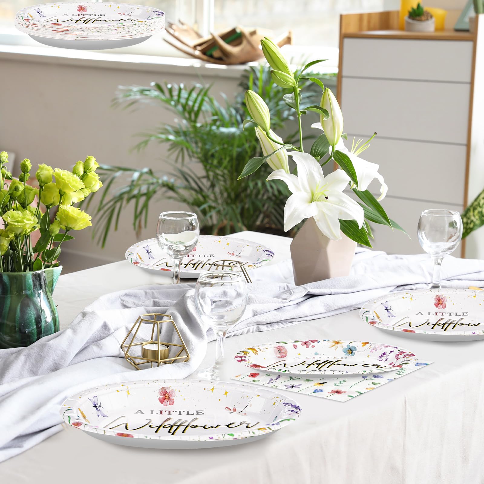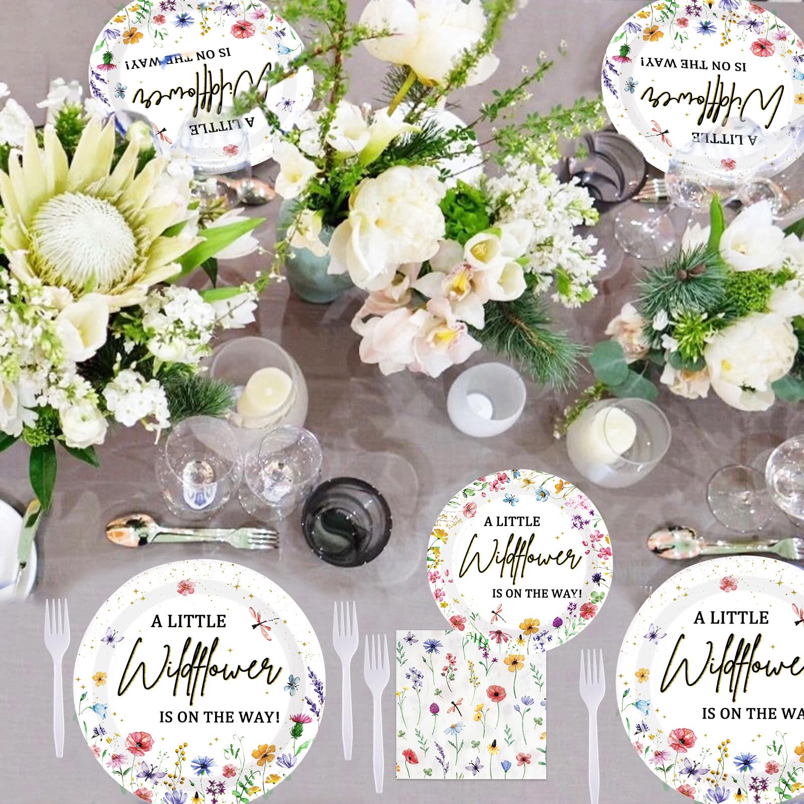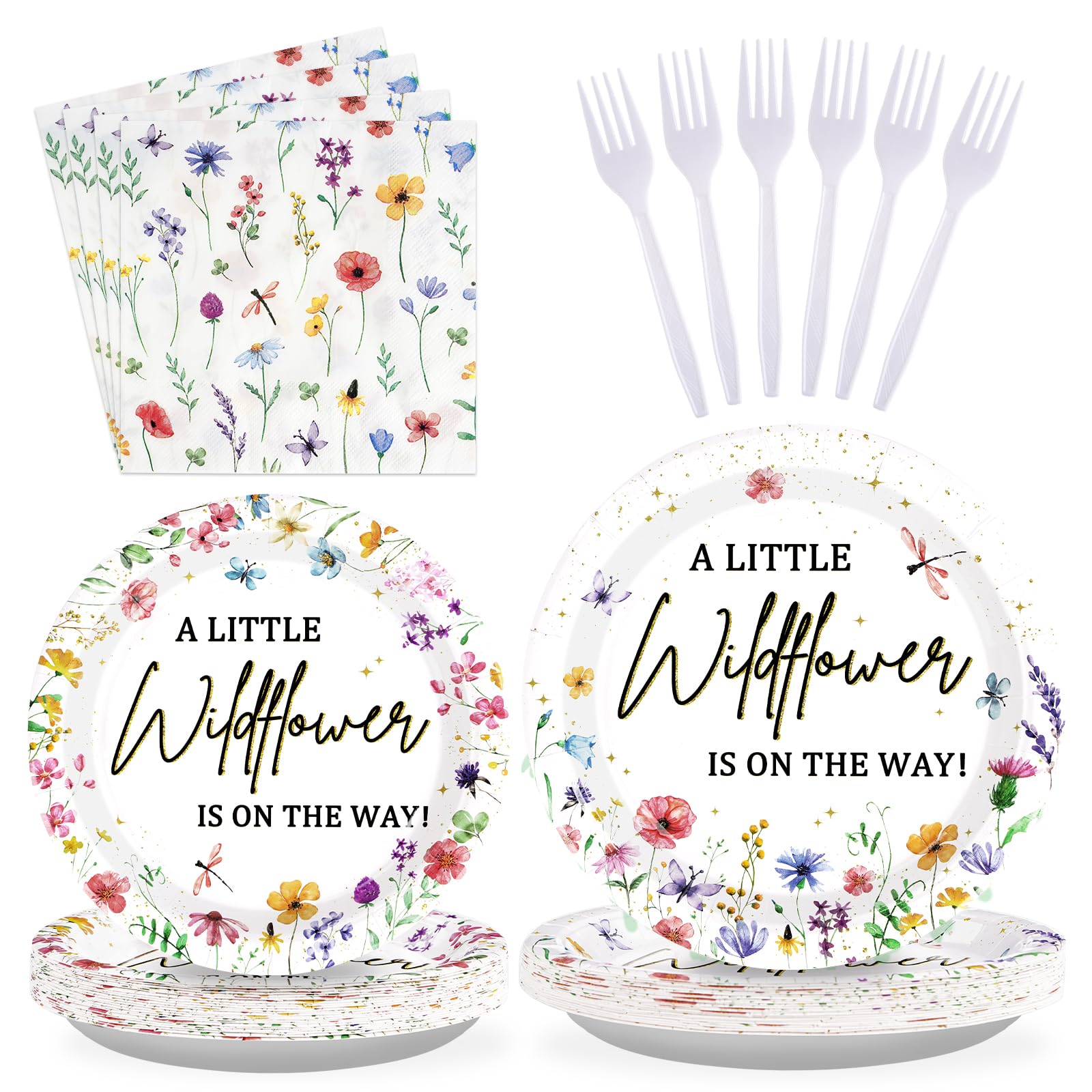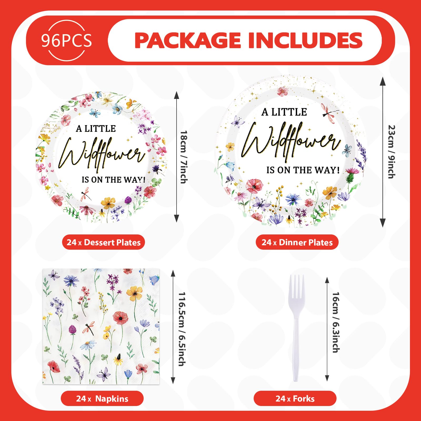 Little Wildflower Baby Shower Decorations: Our wildflower baby shower disposable tableware includes 24 * 9'' wildflower baby shower party plates, 24 * 7'' wildflower birthday plates, 24 * 6.5'' paper napkins, and 24 plastic forks. This little wildflower party decorations kit is specially designed for girl's baby shower. It will definitely be a hit for your special event