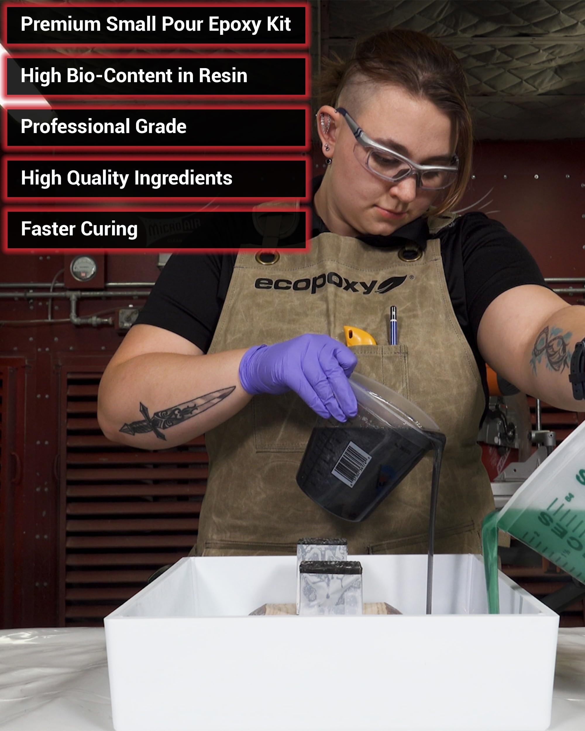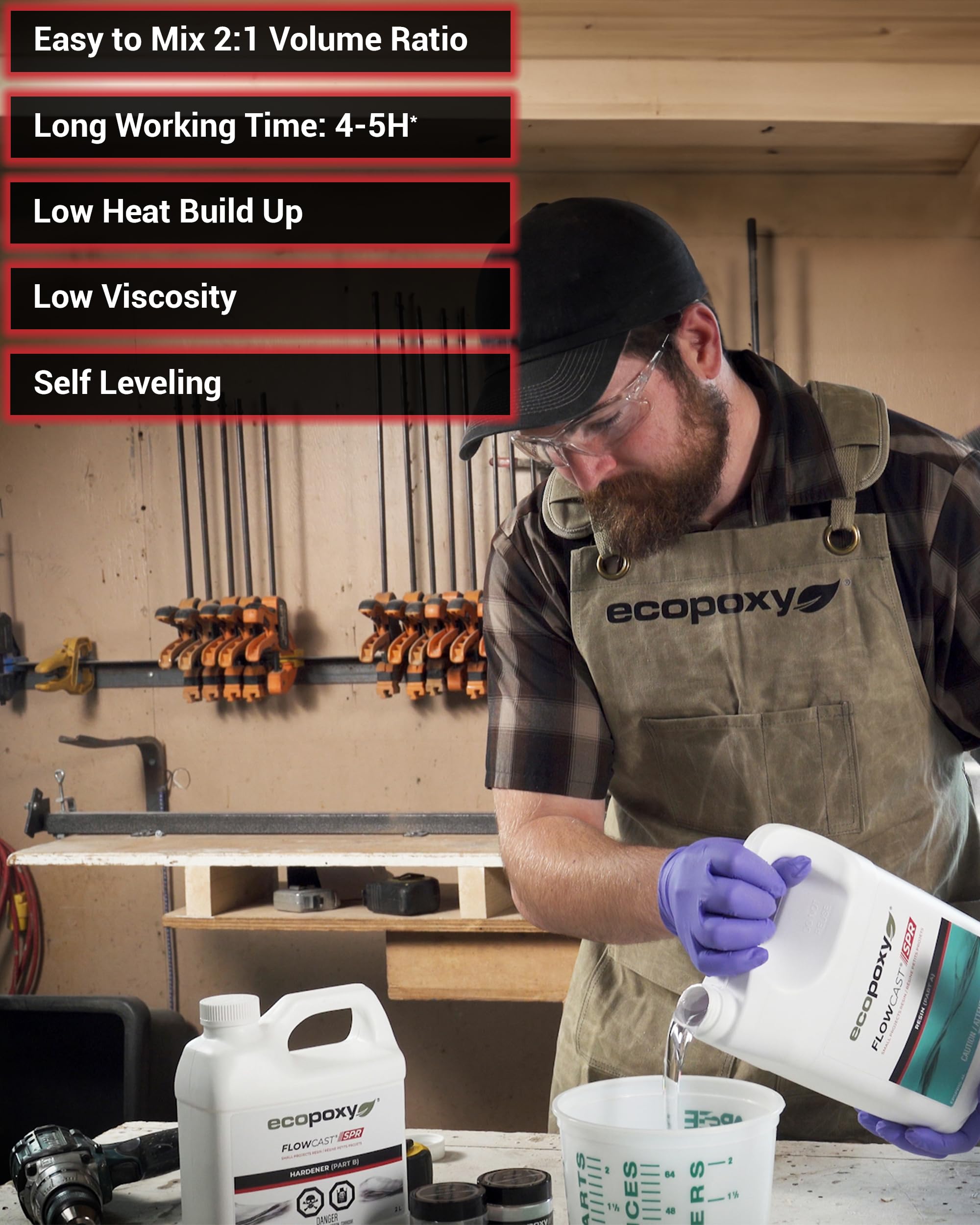 Small Projects Casting Epoxy FlowCast SPR has been formulated with a simple 2:1 mix ratio and is designed for small castings, allowing users to create projects with thinner profiles, such as coasters and serving trays. It can be combined with Liquid or Metallic pigments to create custom colors and effects. FlowCast SPR is intended for pours from 6-25 mm (¼-1") per layer, with a maximum volume of 3 L. FlowCast SPR can be worked using the same tools you have in your woodshop. With our ever-growing line of EcoPoxy pigments and accessories, we can support you with everything you need for your epoxy projects. Used to Create: Serving Trays Drink Coasters Decorative Art Pieces Other Small-Scale Live-Edge Casting Projects