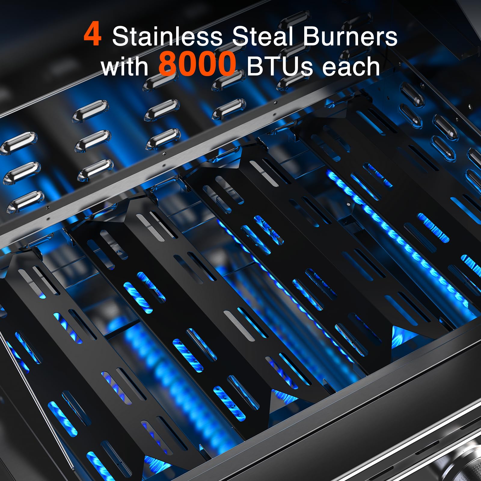 【Powerful Professional Heat】 The 4*8000 BTU main burners are qualified for quick preheating and easily handling large grilling tasks. They ensures even heat distribution across the entire cooking surface, eliminating hot or cold spots. This guarantees every steak is cooked perfectly juicy, preventing burnt outsides and raw insides.