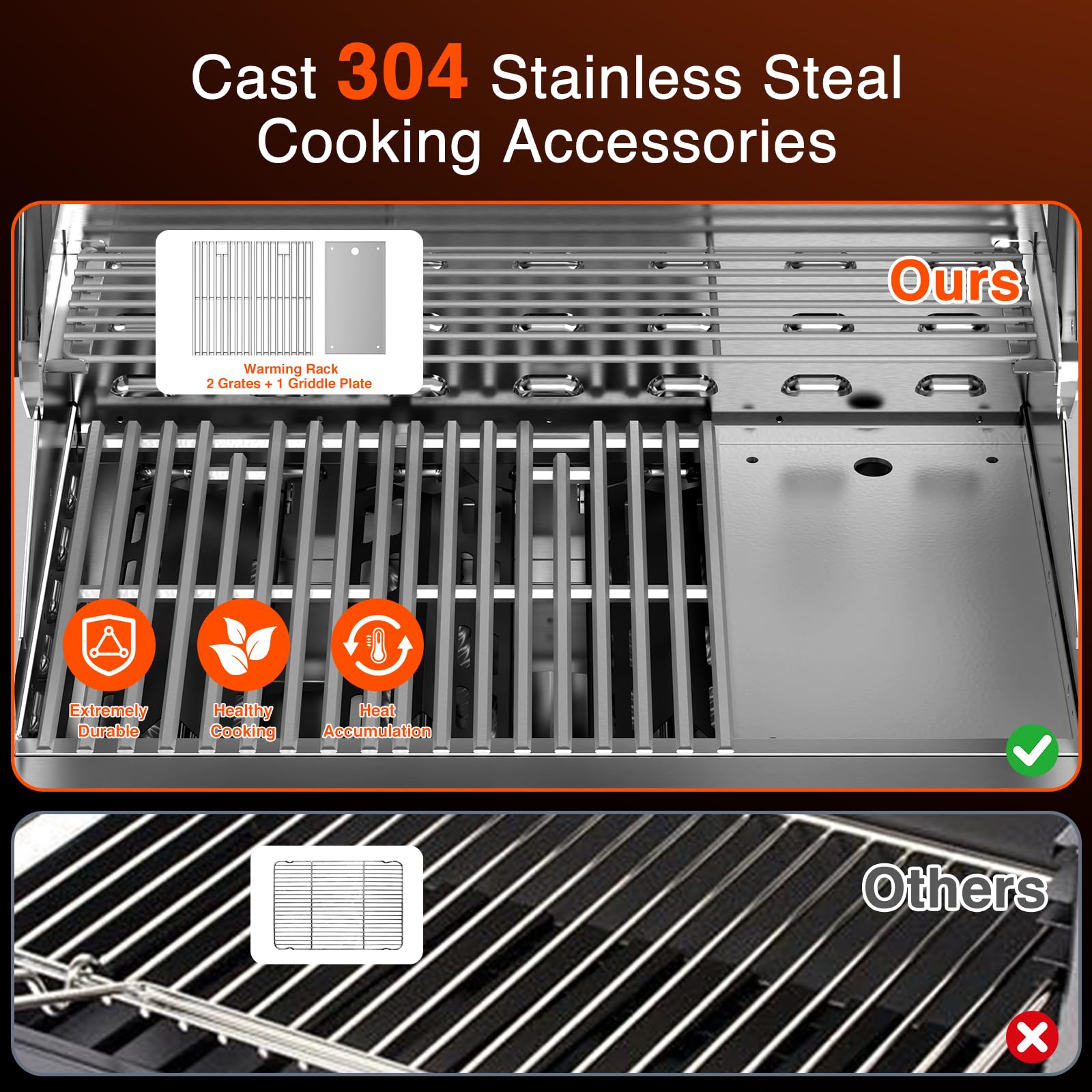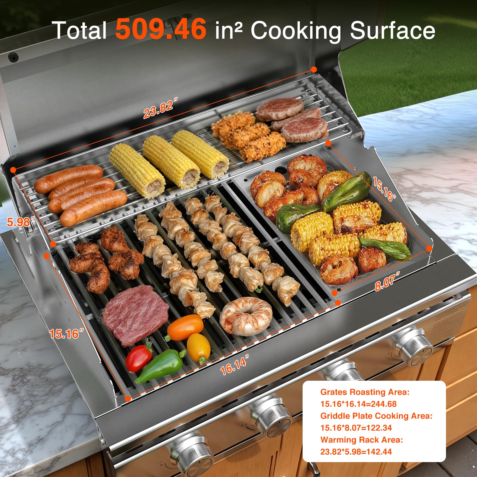 【Versatile & Spacious Outdoor Cooking】 Our built-In gas grill stands out with Cast 304 Stainless Steal two Grates, a Griddle Plate and a Warming Rack. Those provide a massive 509.46 sq.in. of cooking space with 244.68 sq.in. Grates Roasting Area, 122.34 sq.in. Griddle Plate Cooking Area and 142.44 Warming Rack Area. Whether you're grilling, searing, or cooking breakfast classics, it's always ready to deliver delicious results.