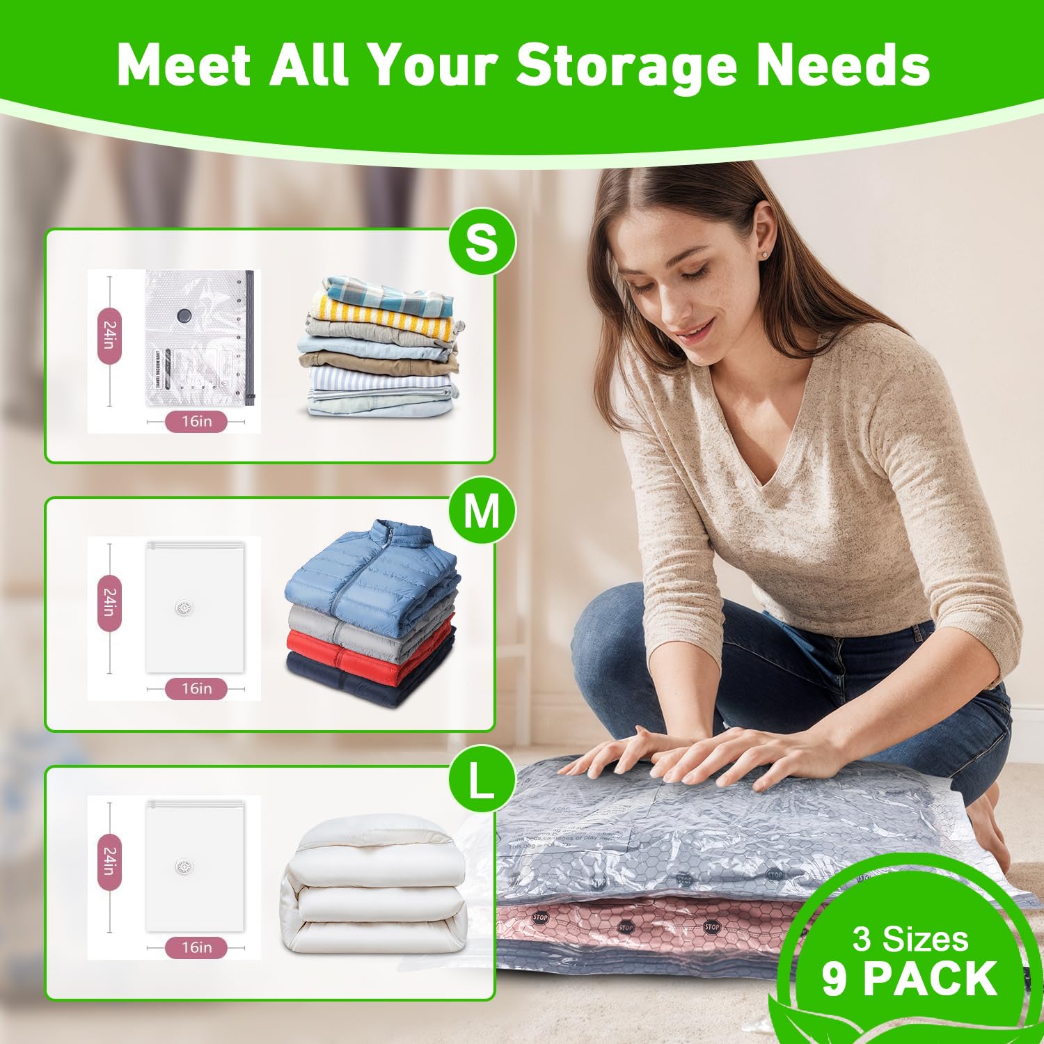 9-Piece Set for All Needs: 3 small (20"×16"), 3 medium (24"×16"), 3 large (24"×20"). These vacuum seal bags for clothing travel mix easily—use some for travel, others for home seasonal storage. One set covers all your organizing needs.