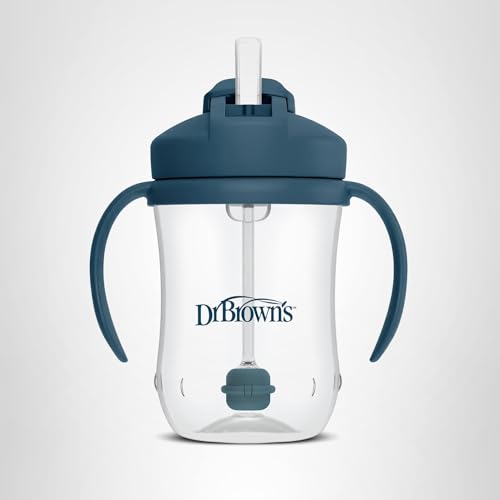 Tip and sip in any direction! Dr. Brown's Baby's First Straw Cup simplifies the bottle-to-cup transition for you and baby. Designed with a soft, weighted straw, baby can drink from any angle – helping them transition from tipping the cup upside-down to sipping upright. Baby's First Straw Cup features handles that lock in place to make it easy for little hands to hold. The cup is contoured, and the handles are removable, so it grows with baby as their cup-holding skills improve. The travel-friendly lid slides open for baby to drink and slides closed to keep the straw clean when not in use – plus it's spill-proof! Comes in lots of fun colors and themes you and baby will love. All parts are removable for easy cleaning. Dishwasher (top rack) and sterilizer safe. Do not put in microwave. Straw cleaning brush included. 9 oz/270 mL. BPA-free. 6m+.