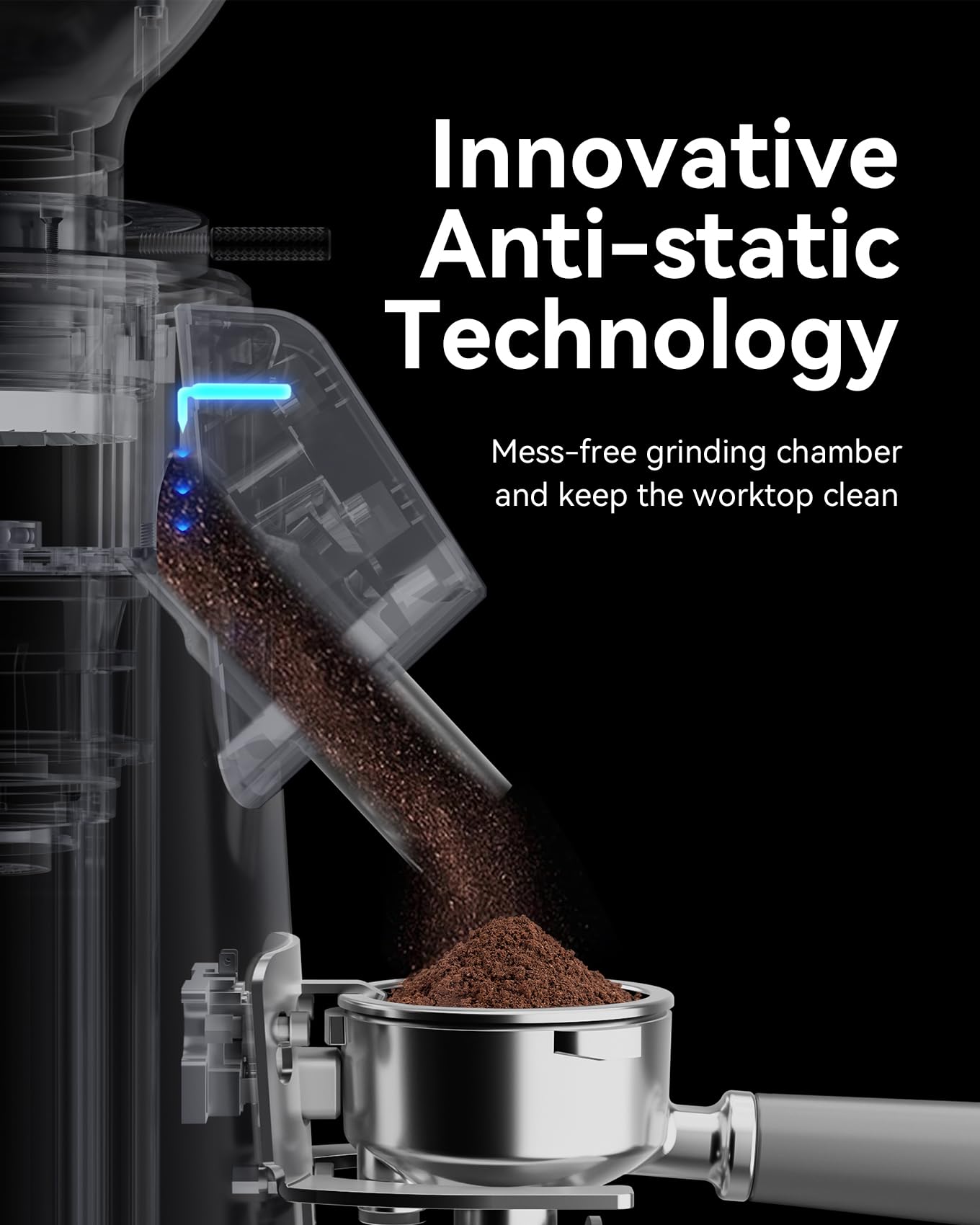 [Equipped with a plasma generator] Plasma Generator inside exit chute reduces static, it effectively prevents coffee grounds from flying and keeps your workspace clean and tidy. Enjoy a quiet grinding experience even during the morning rush.