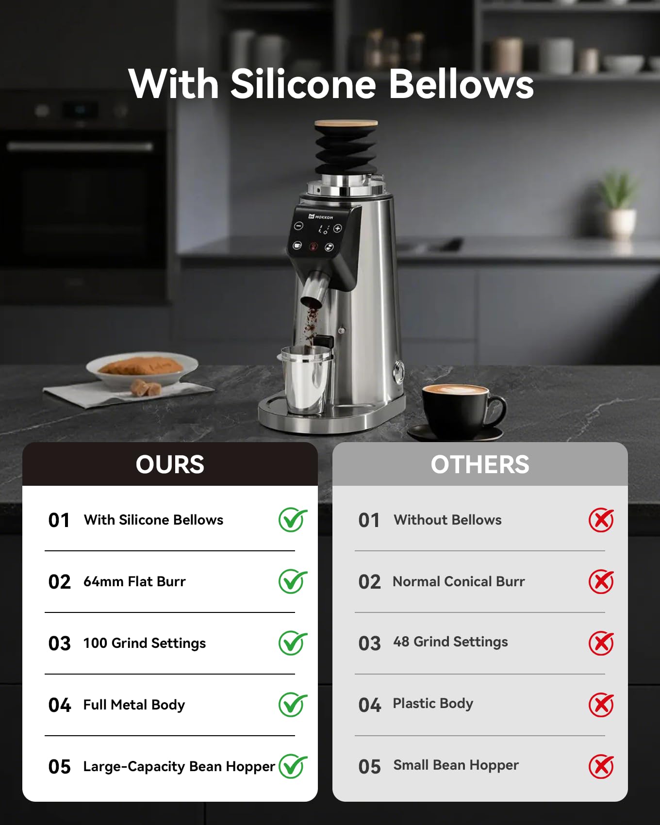 [64mm Stainless Steel Flat Burrs] As a professional coffee grinder, this machine uses 64mm stainless steel flat burrs to ensure uniform grind size for rich, balanced flavor
