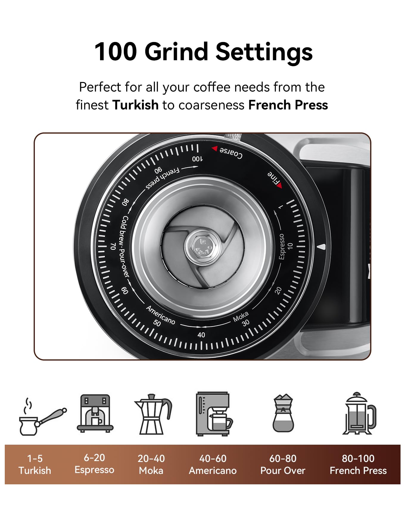 [100 Grinding Settings] This electric coffee grinder offers 100 grinding settings, all-around adjustable grind size scale for precise grinding to fit many brewing methods, from fine Turkish and espresso to coarse French press and cold brew