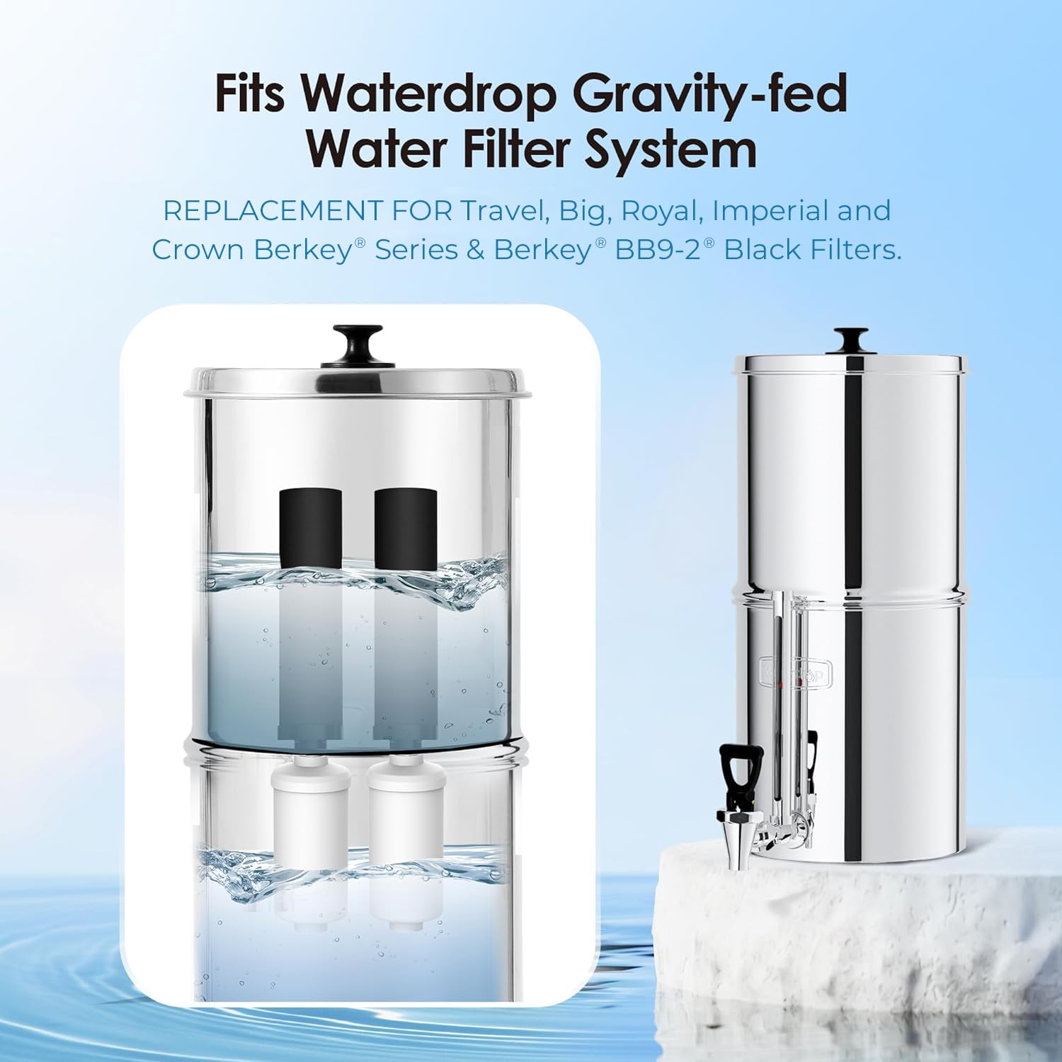 Compatible with: Replacement for Berkey BB9-2 black Filters & PF-2 Fluoride Filters Combo Pack, Travel, Big, Royal, Imperial and Crown Berkey Gravity filter system. And it is compatible with Waterdrop Gravity-fed Water Filter System. The water filter is not sourced by or sponsored by Berkey. Waterdrop is an independent brand.