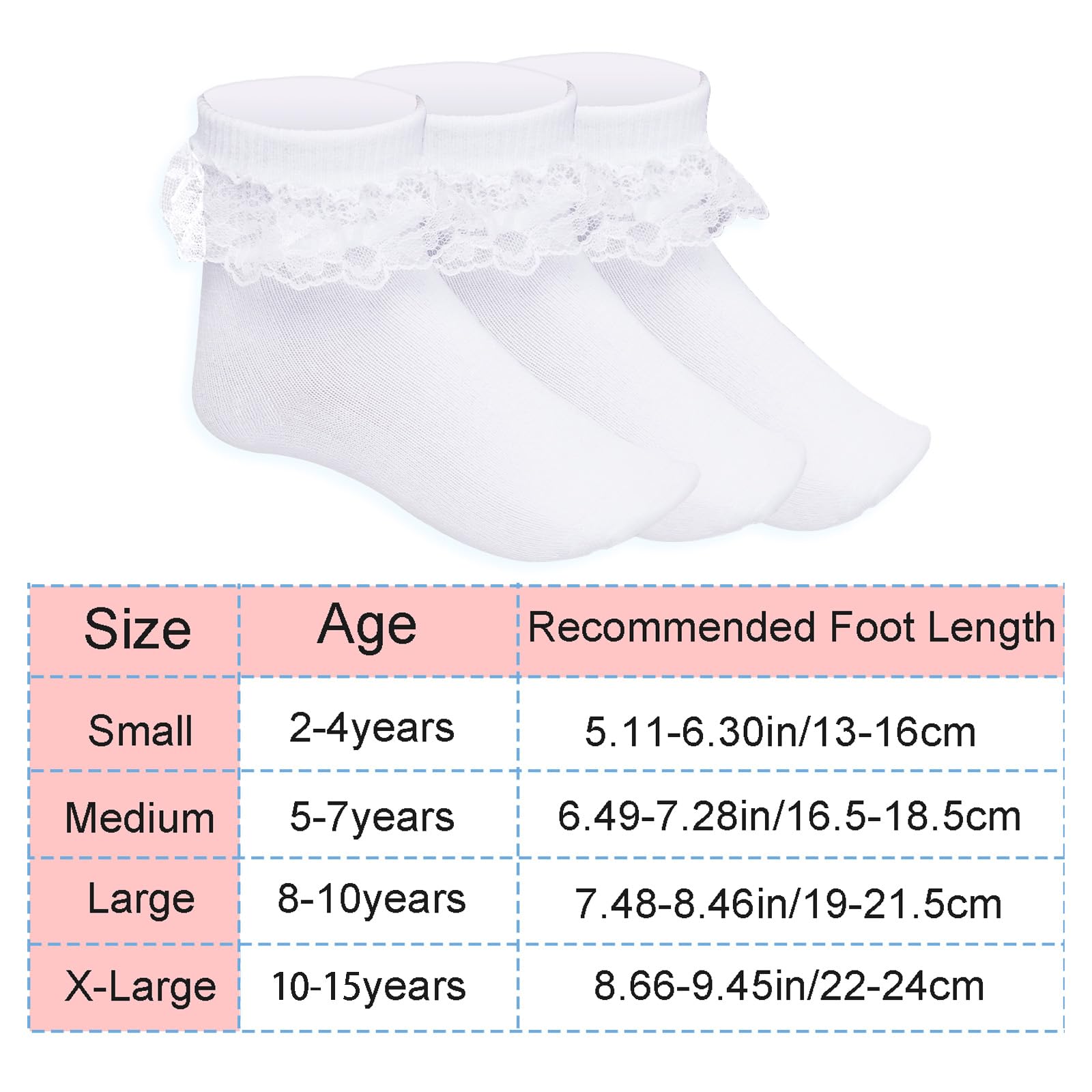 Size M for 5-7 Years: M size ruffle socks for girls are approximately 16.5-18.5 cm/6.49-7.28 inches in length, suitable for girls aged 5-7 to wear. Please carefully check the size information before purchasing.