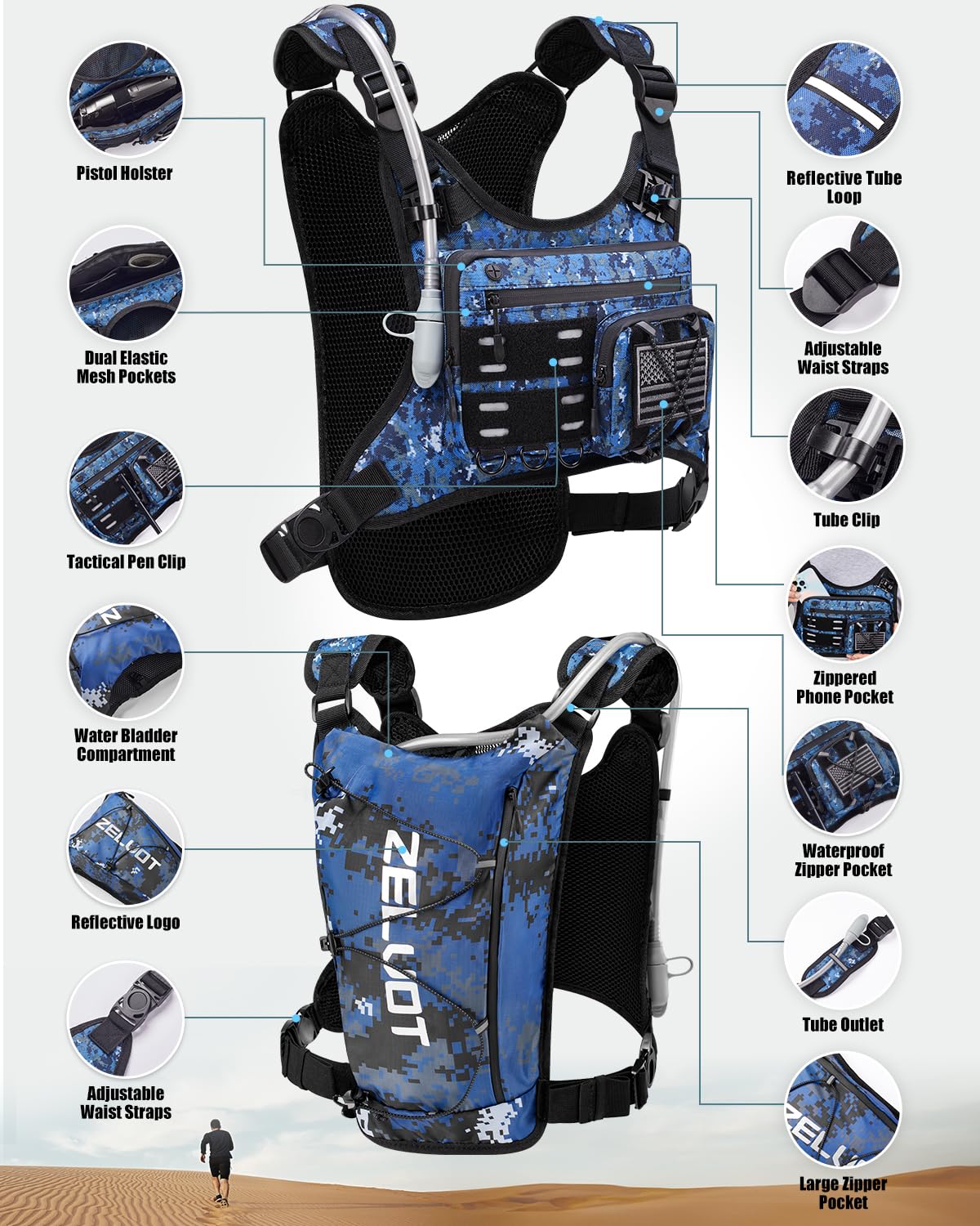 Adjustable Shoulder Straps & Waist Belt - The Zelvot running backpack is designed for optimal comfort, featuring widened adjustable shoulder straps to distribute weight evenly and reduce strain. The adjustable waist belt minimizes bounce and shifting, preventing chafing from an improper fit. The chest adjustability range of this running vest for women or men: 29"- 41", making it adaptable to different body types.