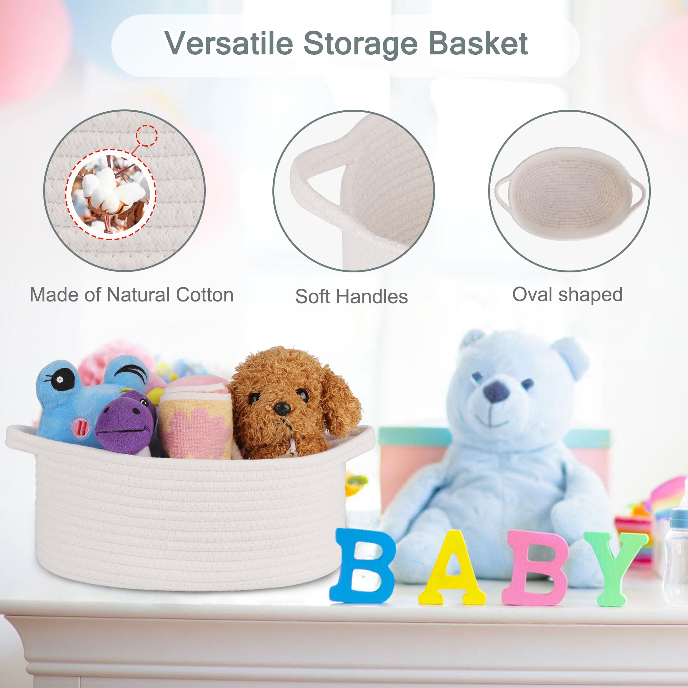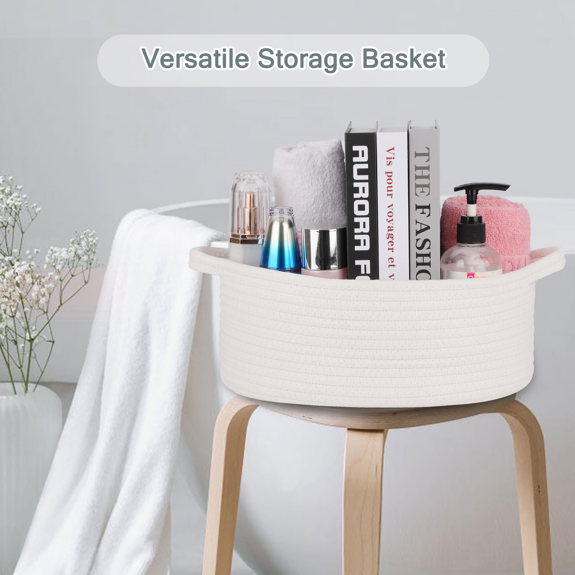 【Versatile Storage Basket】 Our rope storage basket is the perfect organizer for keys, wallets, diapers, books, remotes, toys, makeups, and more. You can use it as a baby basket, end table basket, shelf storage basket, office desk basket, basket for bathroom, kids' toy basket, book basket, shallow basket, and more. It can also be used as a pet toy basket for cats and dogs.