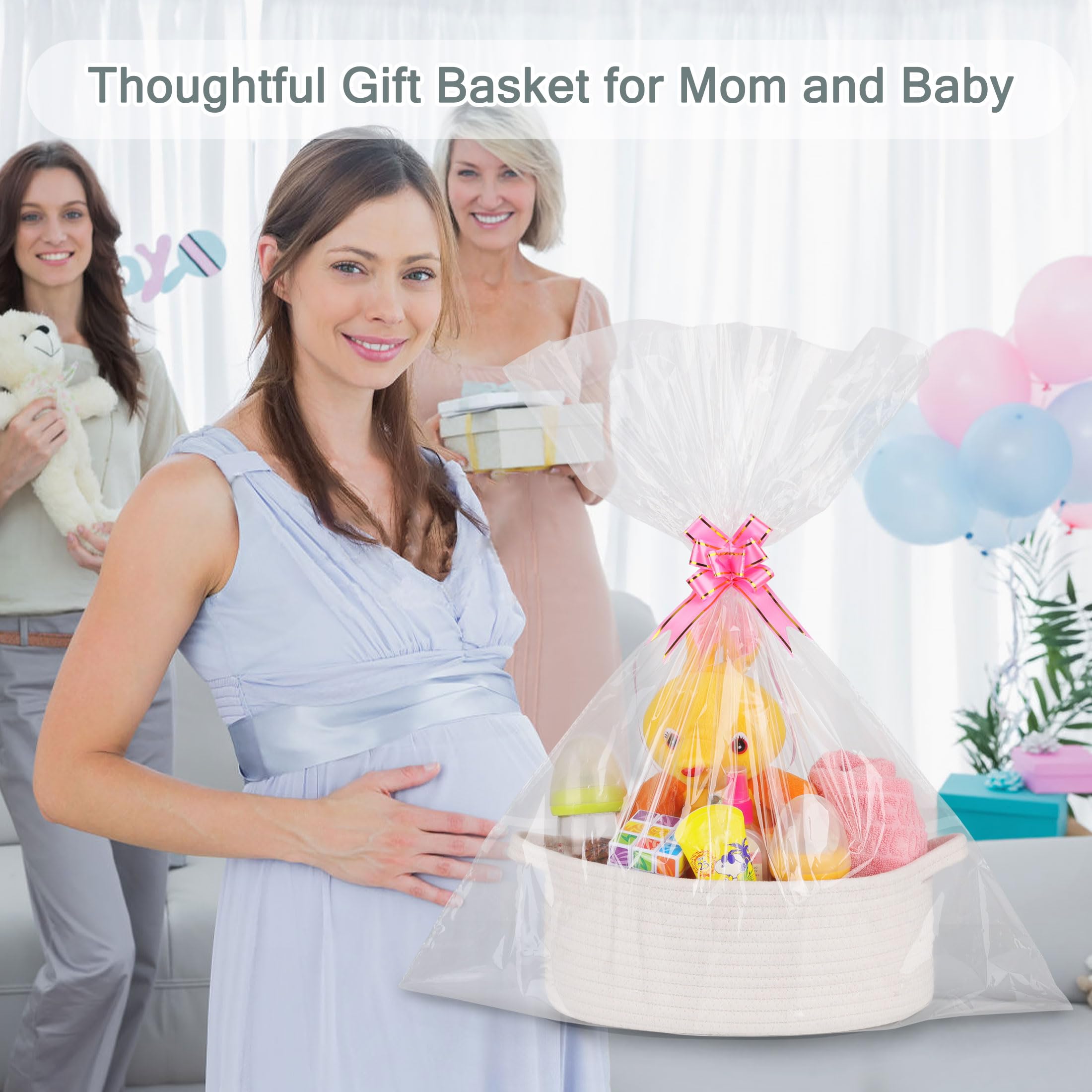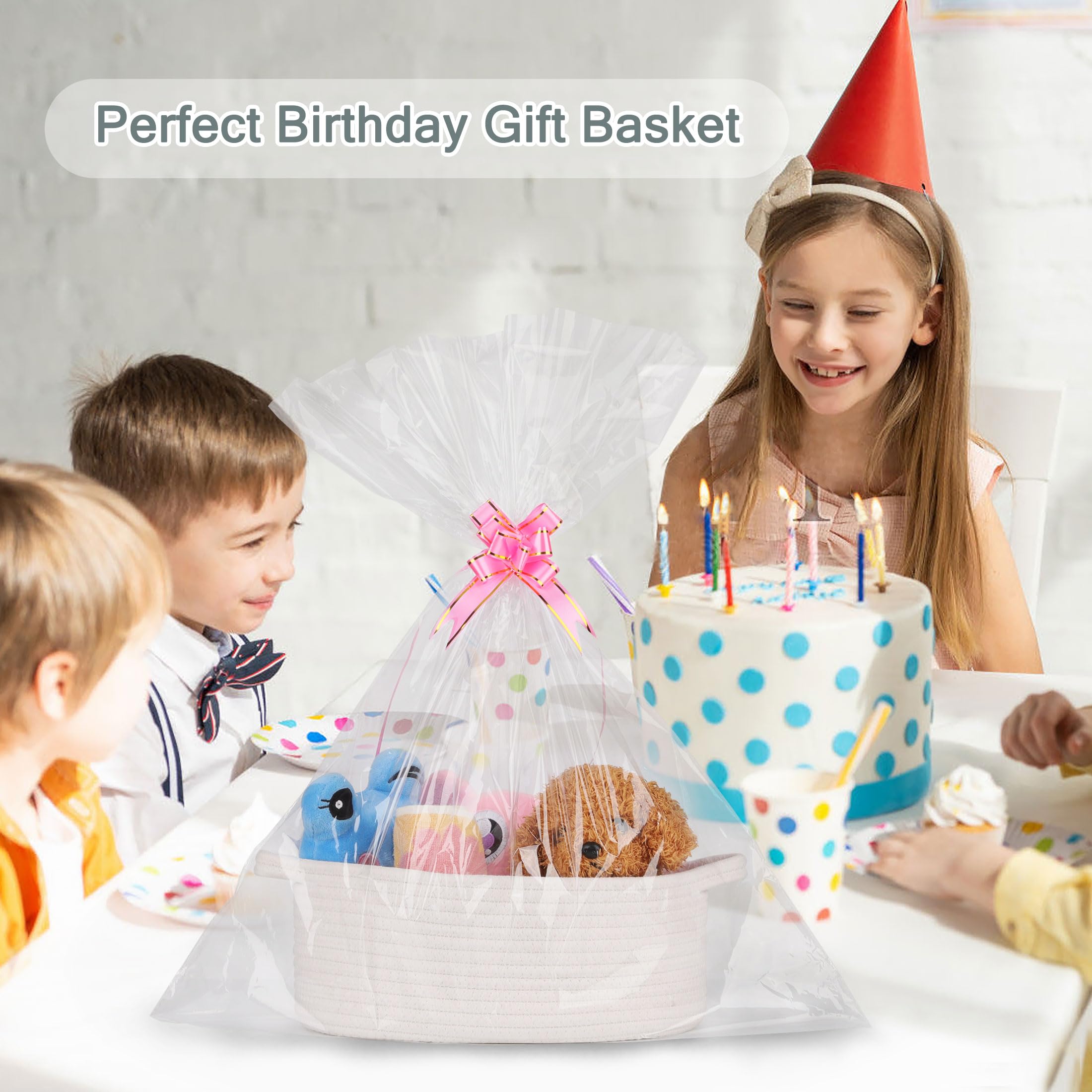【Best Gift Options】 Our woven gift basket comes with one clear cellophane bag and three ribbons of different colors, which is very convenient for making gifts. It is a perfect choice for Birthdays, Baby Showers, Mother's Day, Father's Day, Valentine's Day, Graduation Gifts, Easter and Christmas. This small storage basket itself is a great gift.
