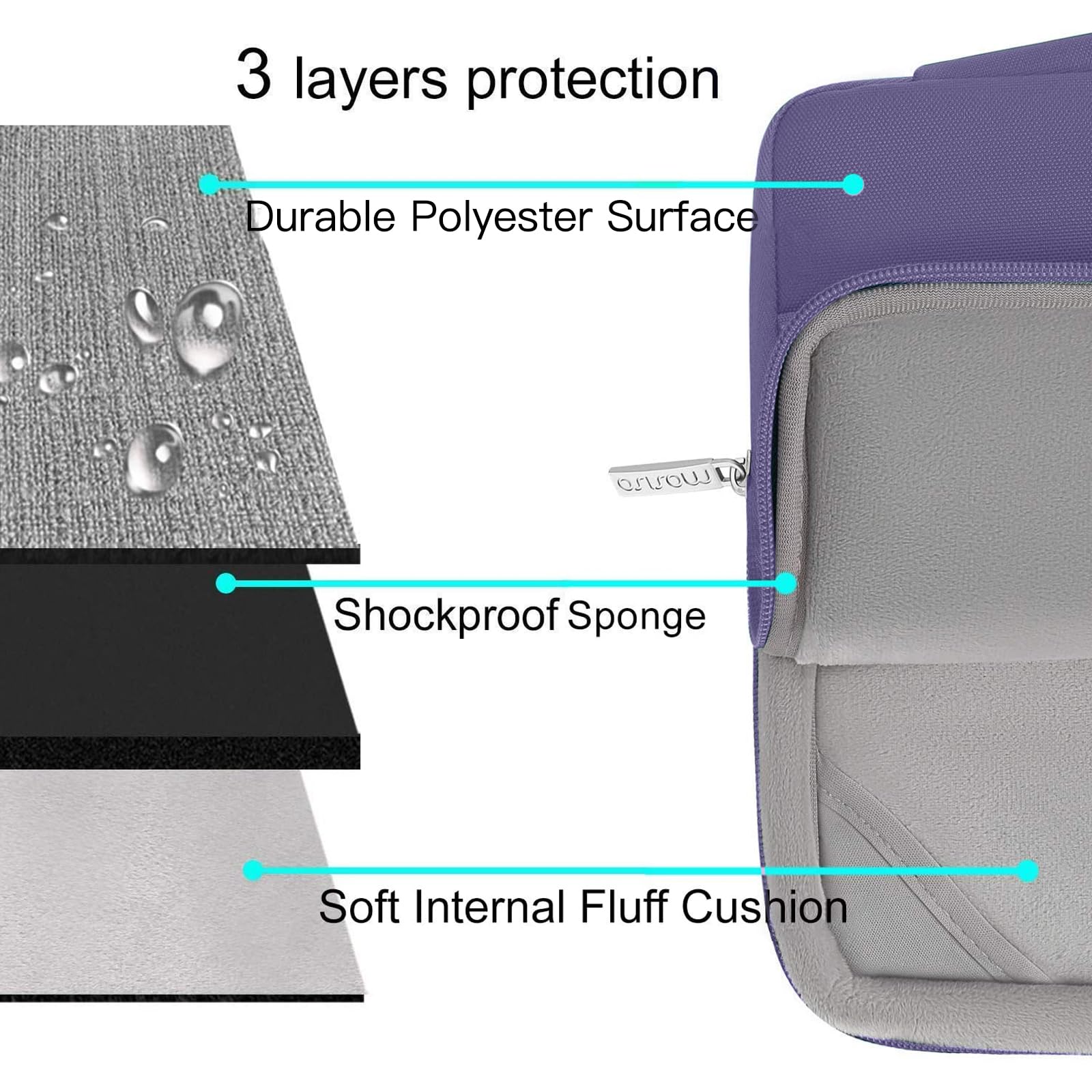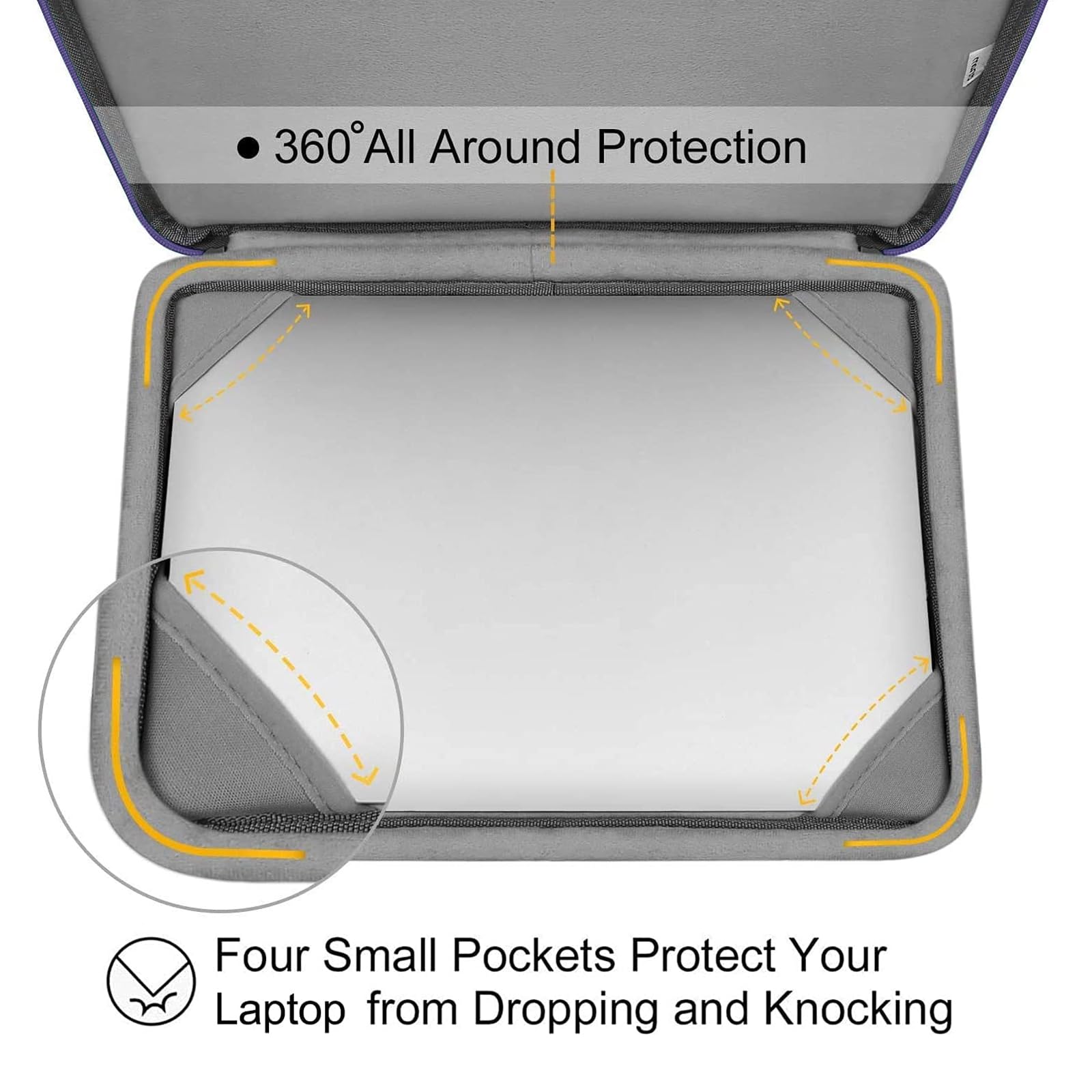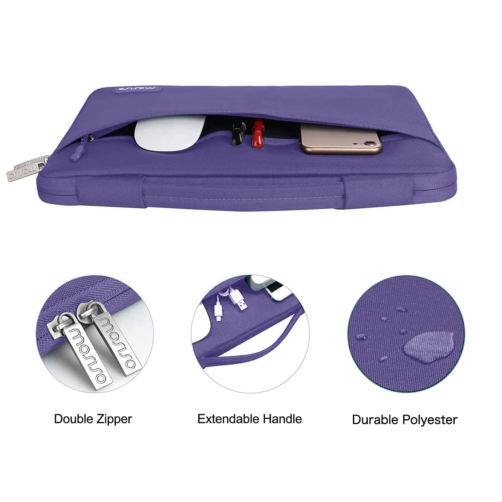 The 360 degree protective shockproof laptop sleeve with handle carrying bag internal dimension: 13.39 x 9.25 x 0.79 inches (L x W x H); external dimension: 13.98 x 9.84 x 0.79 inches (L x W x H). The front side pocket dimension: 11.61 x 9.25 inches (L x W). Made of polyester material, protect your laptop against accidental spills. Slim and lightweight, does not bulk your device up and can easily slide into your briefcase, backpack or other bag. Ideal for business, daily and travel.