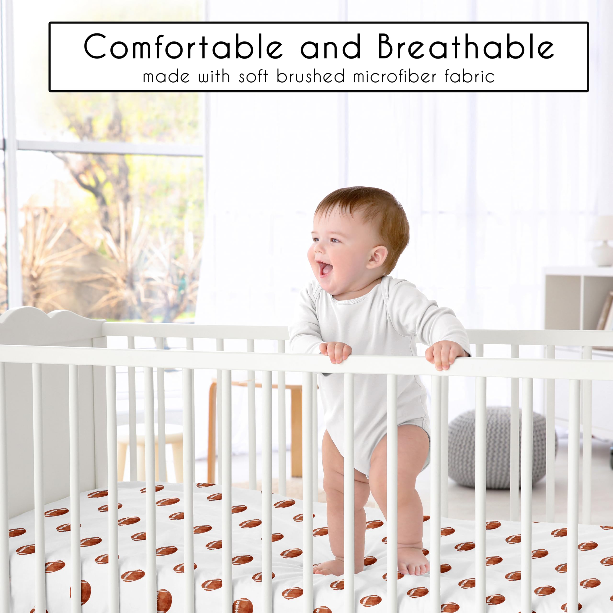 SNUG FIT: Includes (1) Fitted Crib Sheet 52in. x 28in. x 8in. Our newborn standard crib sheets fit snugly, with premium elastic sewn around the entire bottom edge for a secure fit on most standard sized cribs & toddler beds, to reduce shifting & bunching. This brushed microfiber crib sheet features an exclusive design of a brown and white football balls print for the watercolor, sport themed Vintage Sports Theme Collection and is gentle on delicate skin to foster a soothing sleep environment.