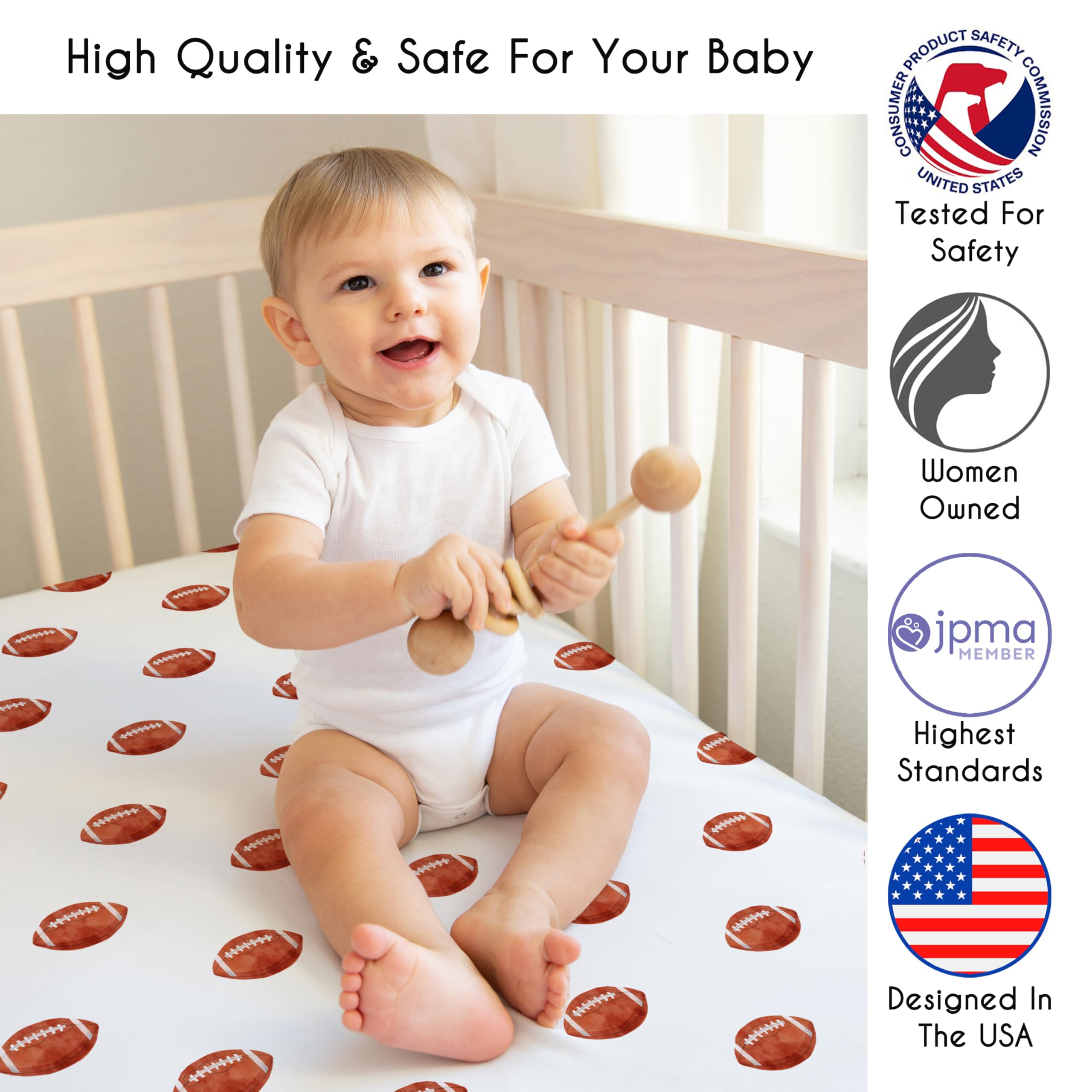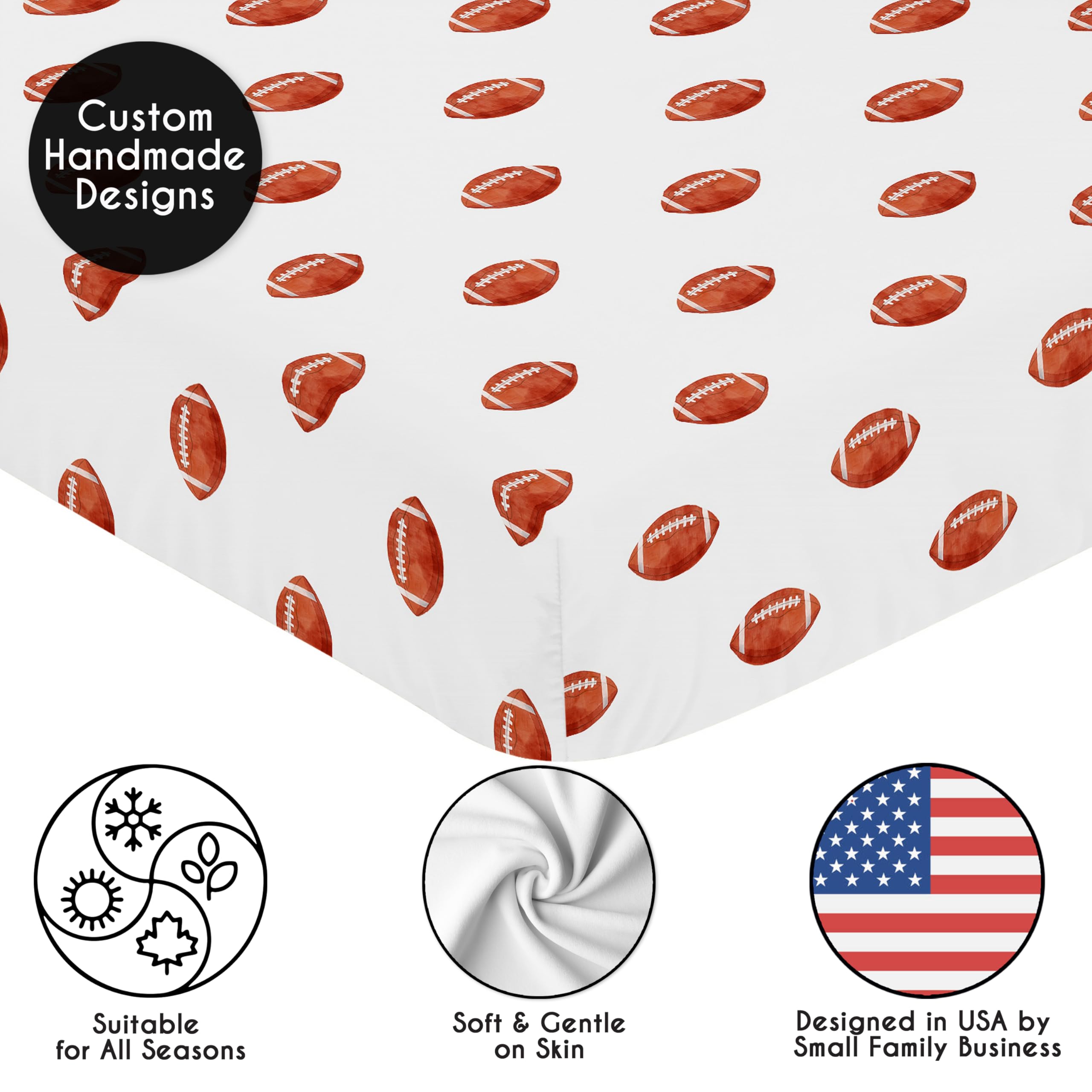 DESIGNED IN THE USA: By real parents who understand the need for comfort, practicality, and style. Sweet Jojo Designs is a small, women owned business. The mom's on our team know a crib mattress sheet is first priority for your baby essentials to ensure a restful night of sleep. We use top fabrics and designs to create soft crib sheets that are stretchy & comfortable for your infant or toddler. We've studied the latest trends in football crib sheets for baby boy to bring you the finest product.