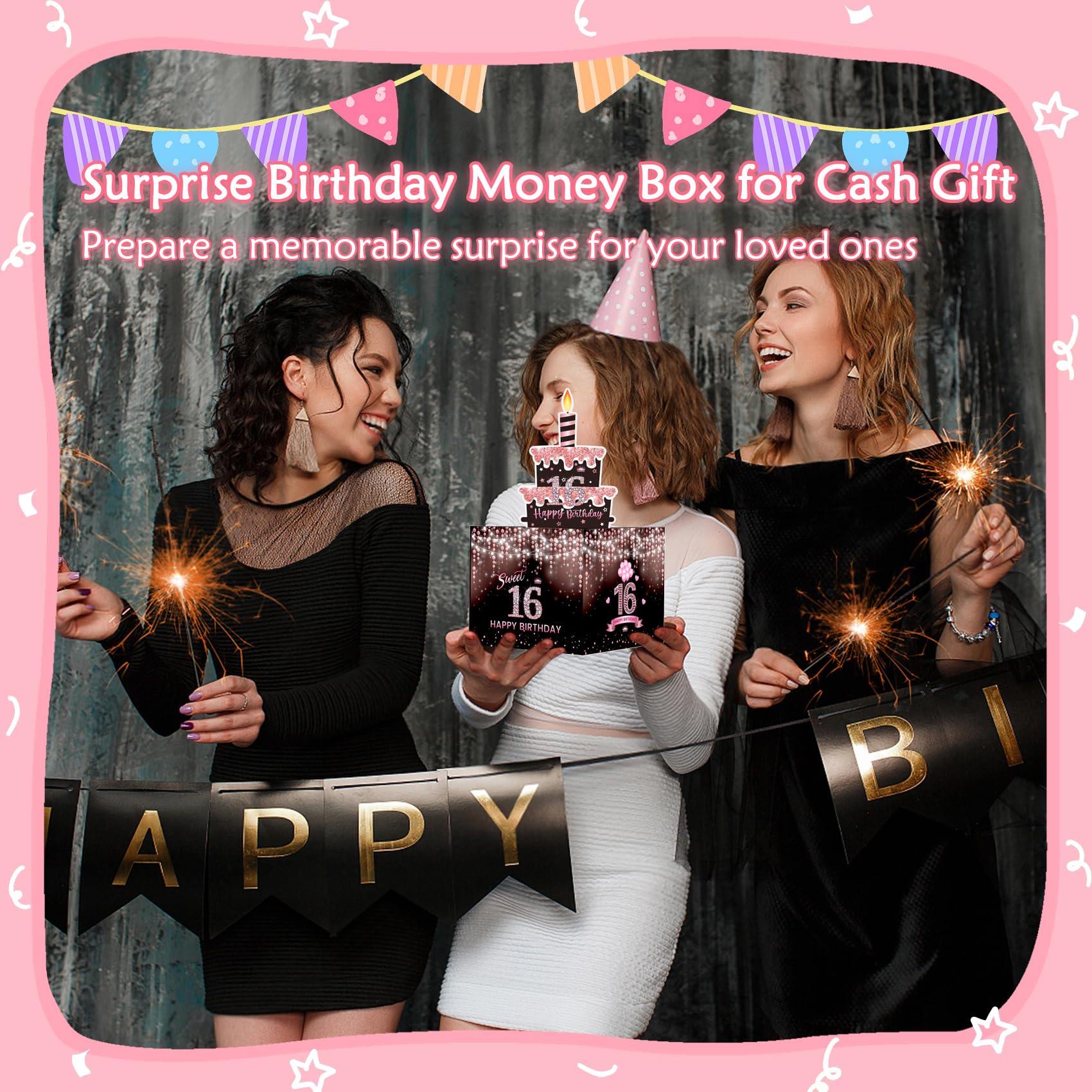 Perfect 16th Birthday Money Pull Box Design: Happy Birthday Money Box measures 4.3" x 5.3" x 5.3" and is made of sturdy cardboard with a happy birthday-themed pattern. There is adhesive tape on the inside of the birthday cake card to fix the money roll. The size of the plastic bag is 3.15" x 7.89" (the size of the US dollar is 2.61" x 6.14"), and 50 plastic bags are enough for you to hold the US dollar amount you want to customize. Not only is this a surprise gift, but it's also an elegant way to offer cash.