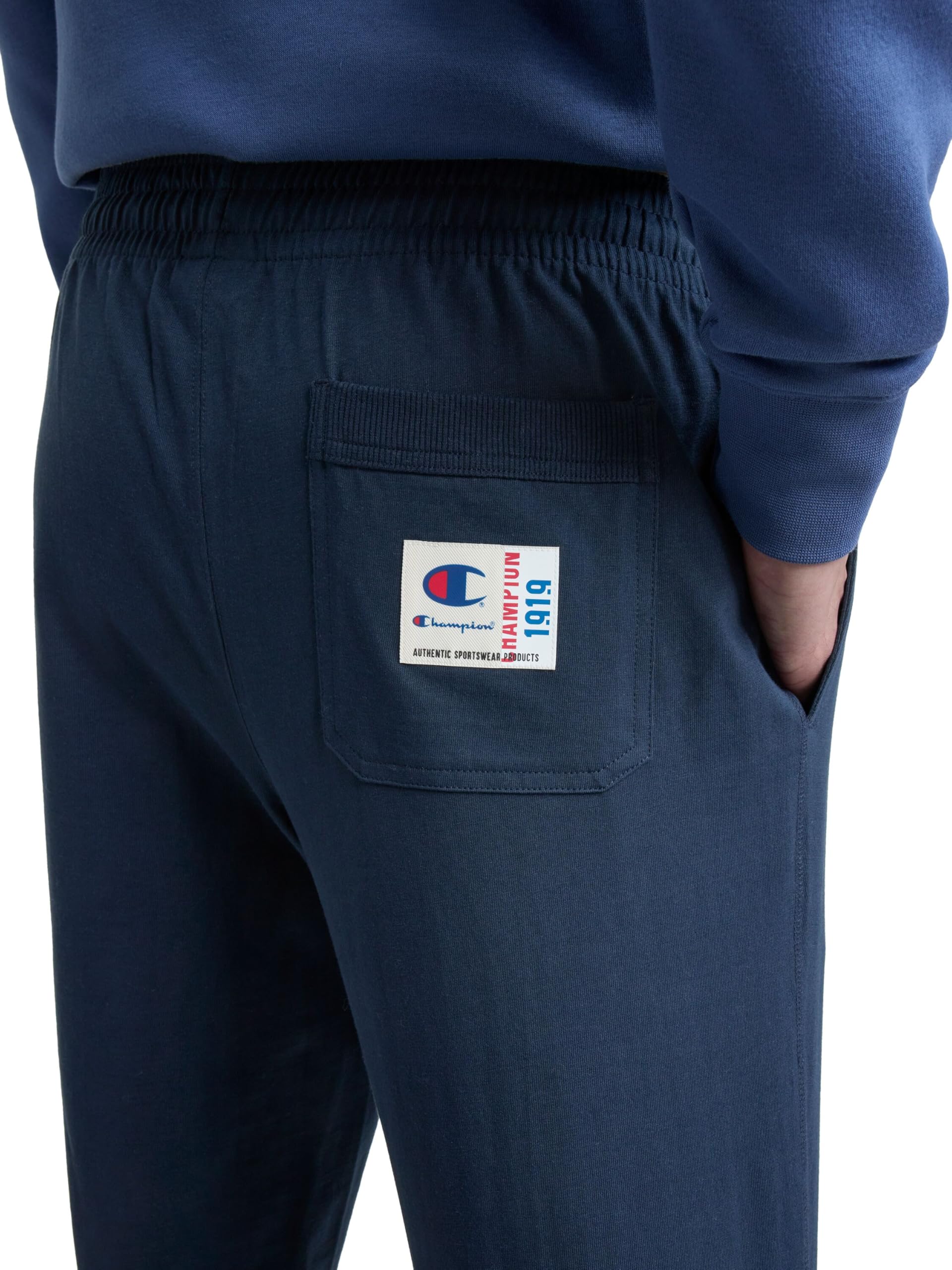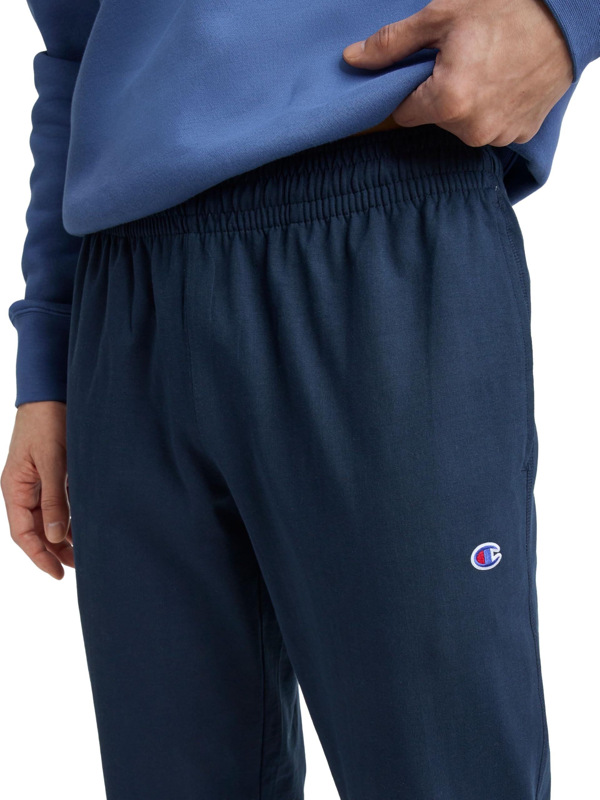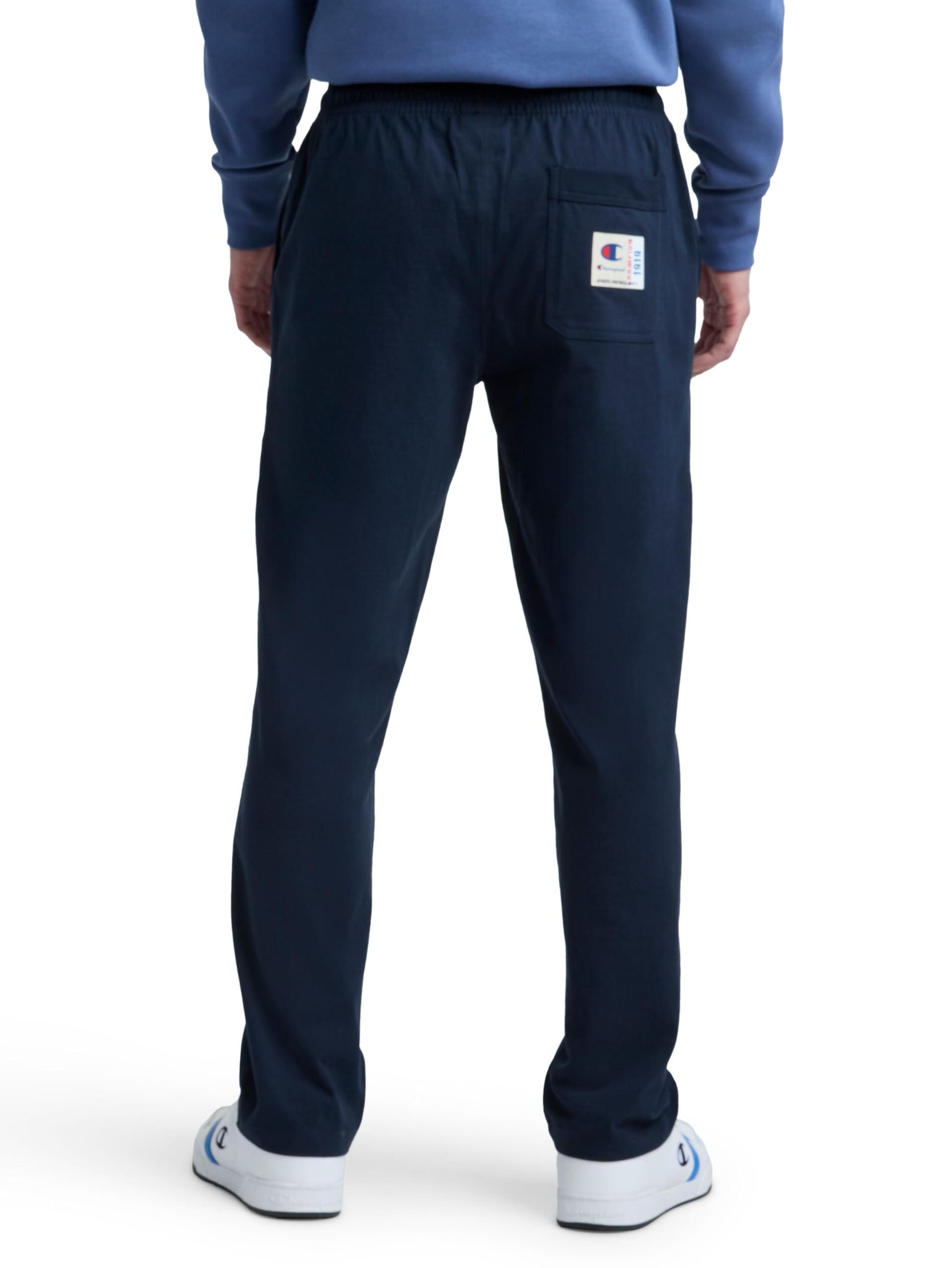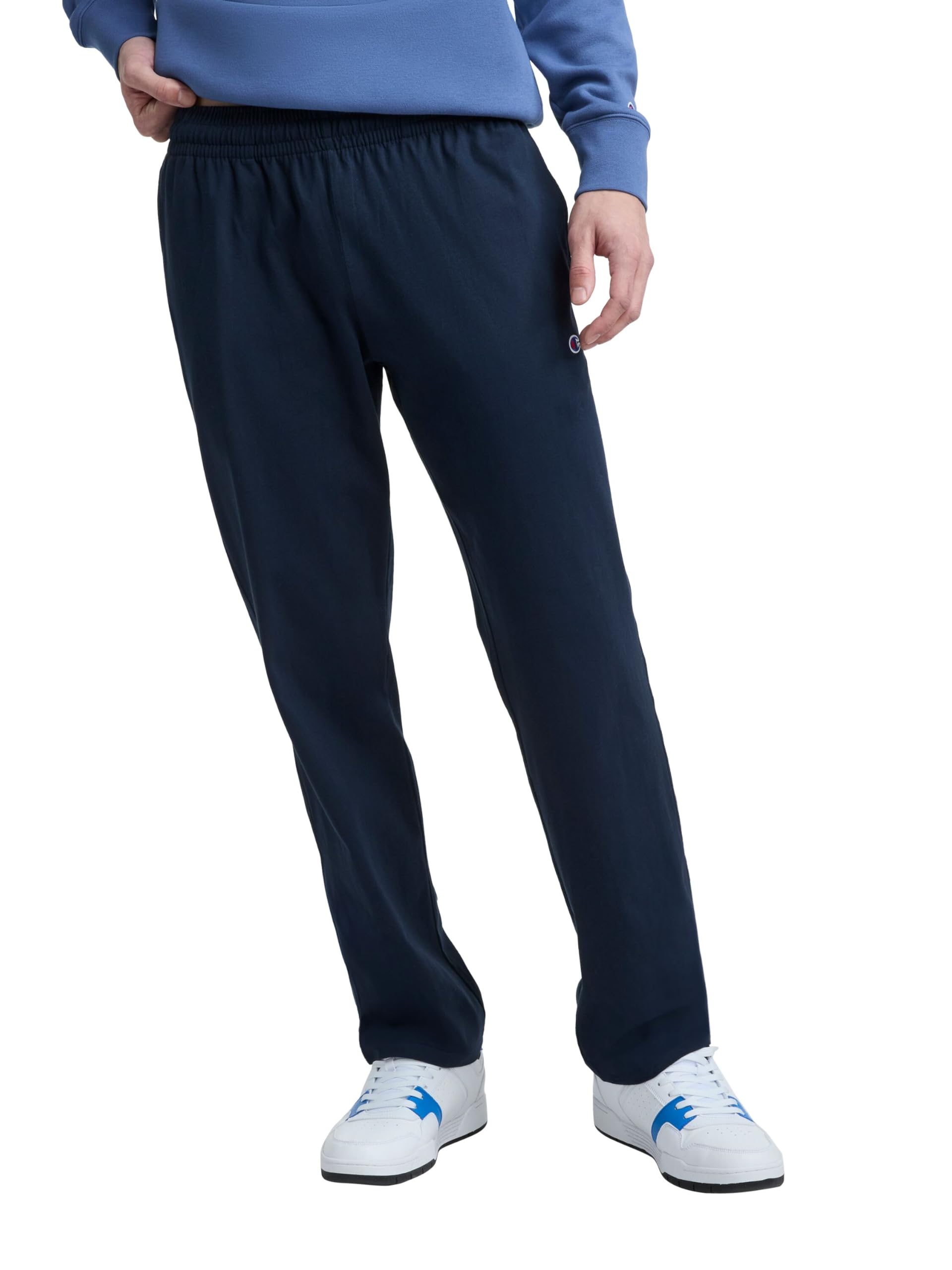 Description CLASSIC CHAMPION STYLE. These men’s open-hem lounge pants deliver ultimate lightweight comfort and are as soft as your favorite jersey knit t-shirt. Made for everyday at-home wear, their minimalist design features a stretch waistband with drawcord closure for a customizable fit. Convenient side pockets are the perfect place to store your phone, wallet, and more, while the open hem completes the laid-back look. These men’s lounge pants are finished with a Champion C logo patch at the left hip and are ready to be paired with your favorite tee or hoodie for an effortlessly cool 'fit.