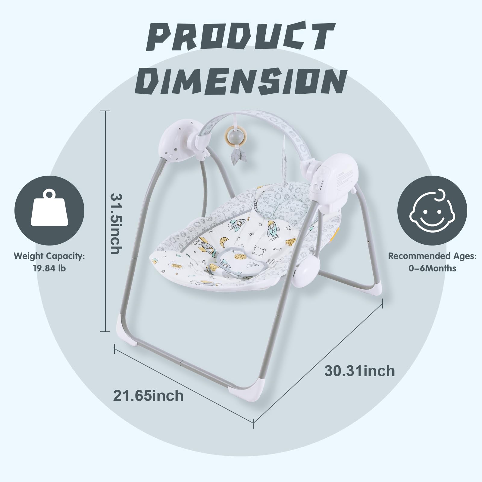 Foldable & Portable Design:Baby swing folds compactly for storage or travel, perfect for on-the-go families or small apartments. When fully opened, it measures 31.5 x 31.5 x 22.05 inches, Disassembled and folded to a controlled size of 18 x 5x 14 inch, offering a roomy and secure space for your baby to relax indoors or outdoors.