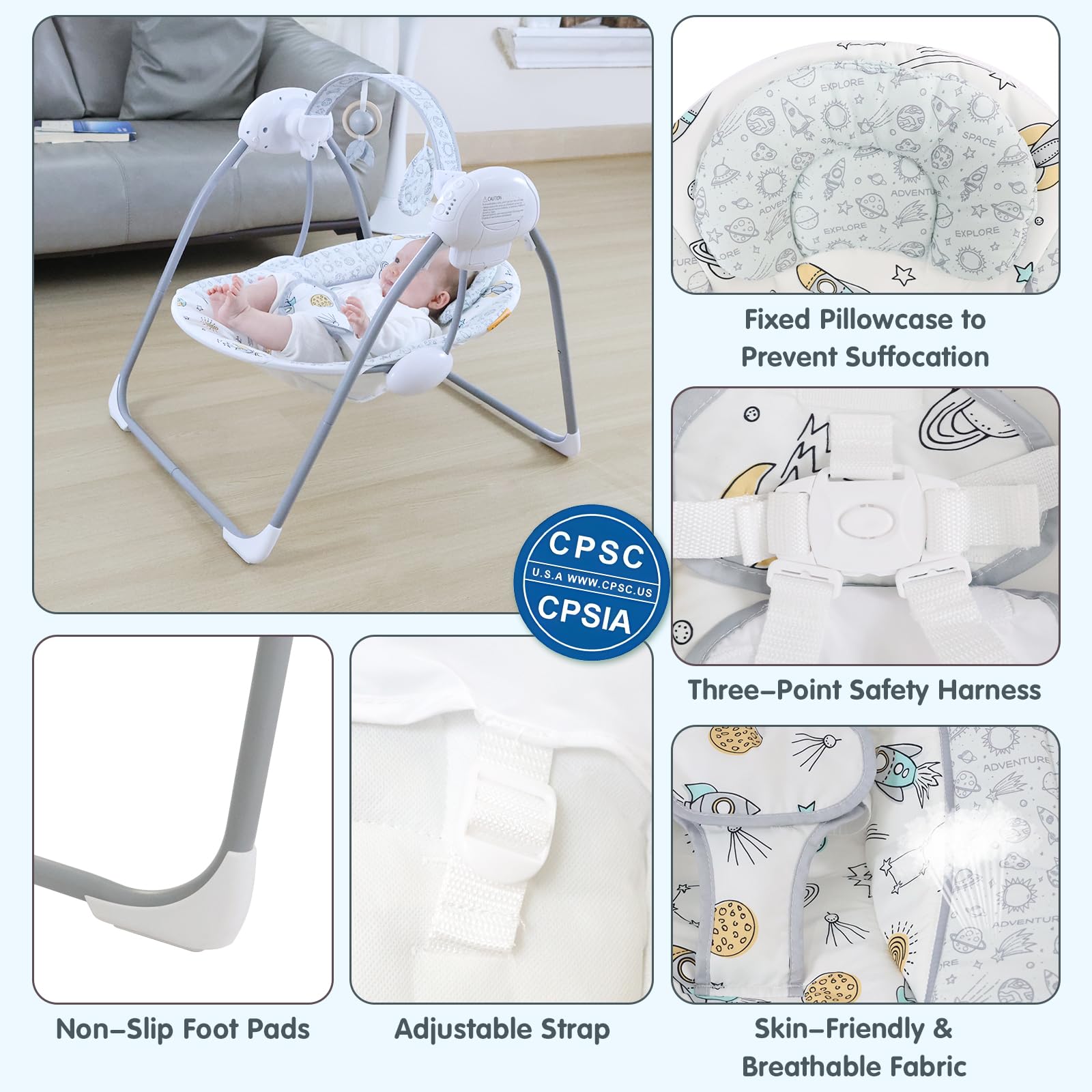US CPSIA & ASTM Certified Safety:This baby swing Crafted from non-toxic, odor-free materials. Designed with smooth edges and no sharp parts, it has passed rigorous CPSIA and ASTM testing, including checks for stability, load-bearing, suffocation resistance, and structural strength—giving you peace of mind every time your toddler swings.