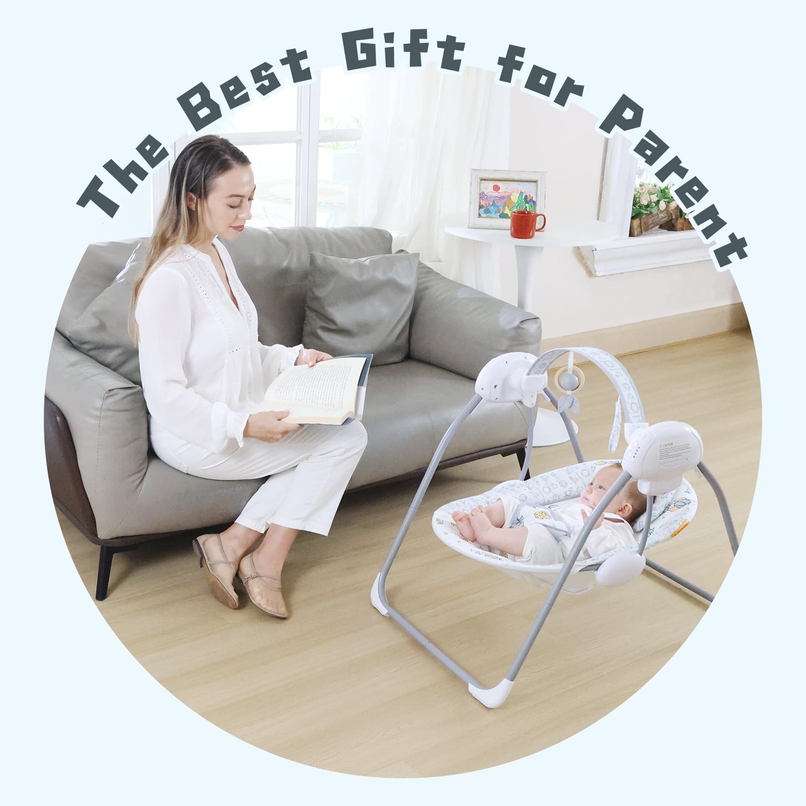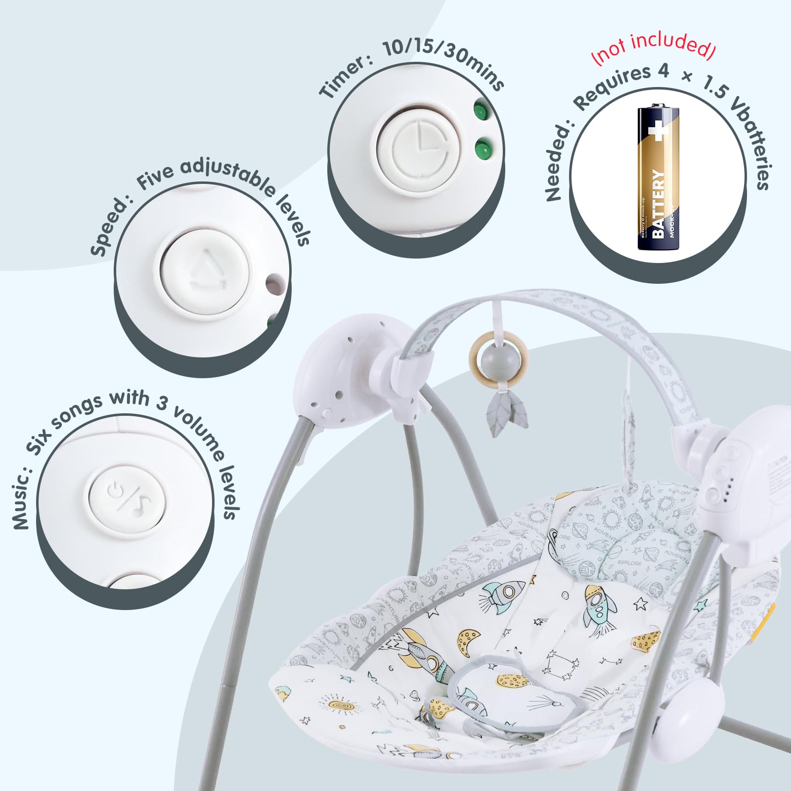 5-Speed Adjustable Swing & Timer Function:This electric baby swing features 5 swing speeds and 3 timer settings (10/15/30 mins) to meet your baby's different soothing needs. The adjustable motion calms your baby gently. Adjustable baby swing, smart swing with timer, soothing motion rocker.