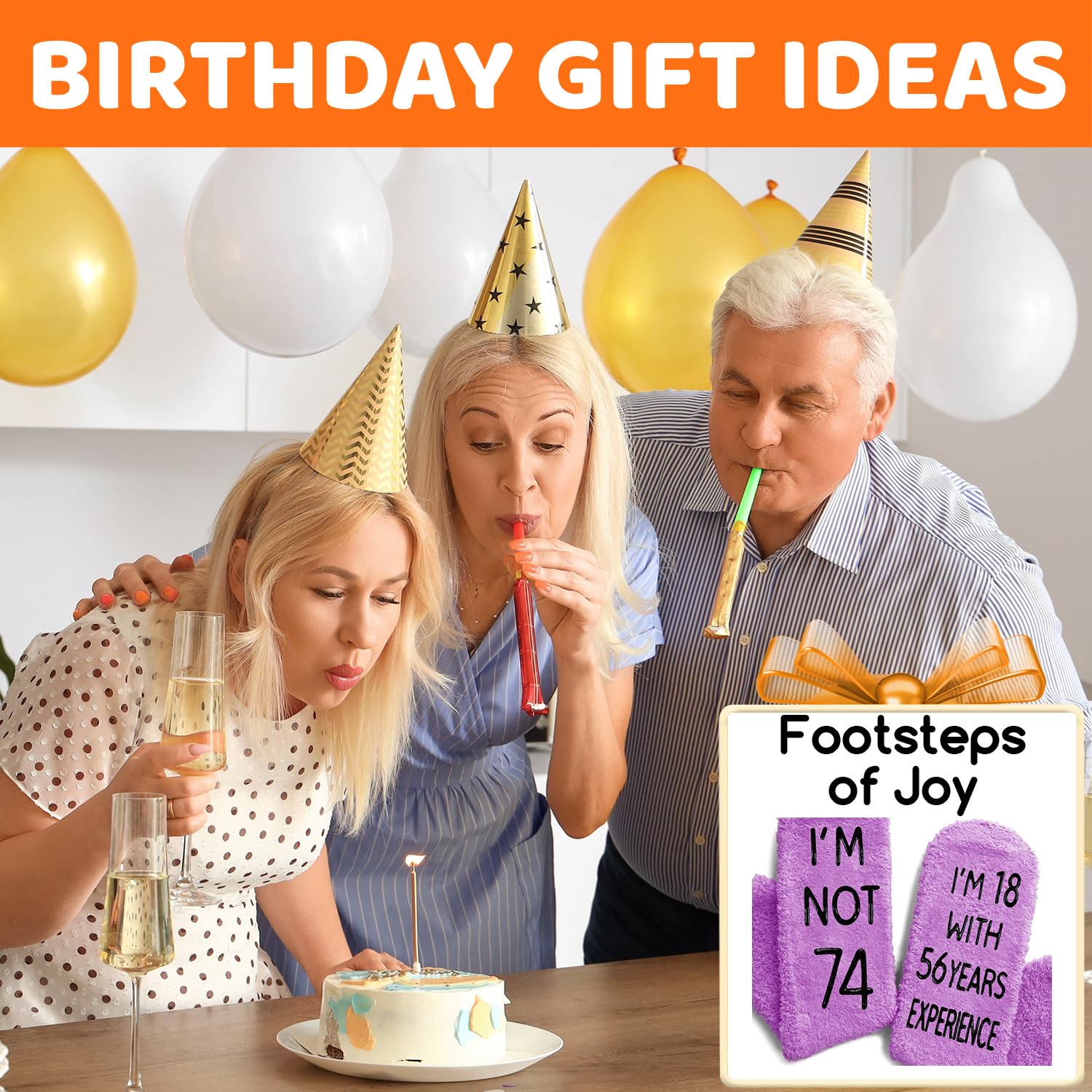 GIFTS FOR HER: Say it with socks - "I'M NOT 74, I'M 18 WITH 56 YEARS EXPERIENCE." These are suitable for any holiday gifts, such as Birthday gifts, White Elephant gifts, Christmas gifts.