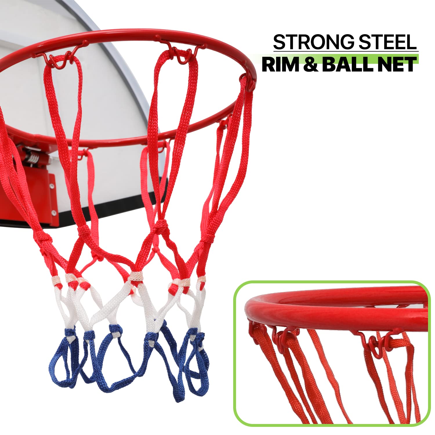 You Will Get - A steel-rim basket, ball net, backboard, 1 rubber basketball, an air pump, and complete mounting hardware.