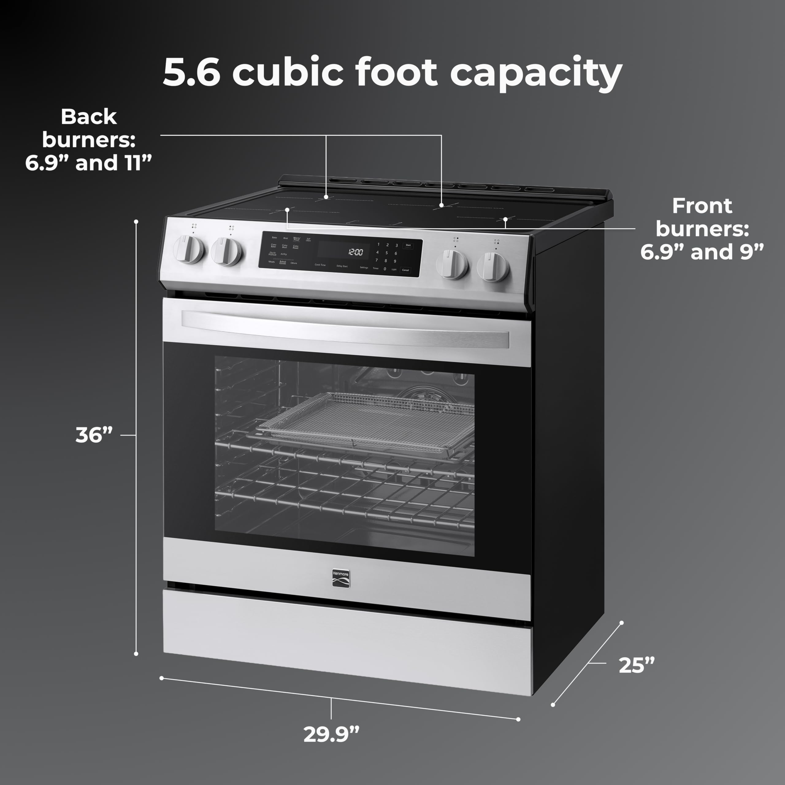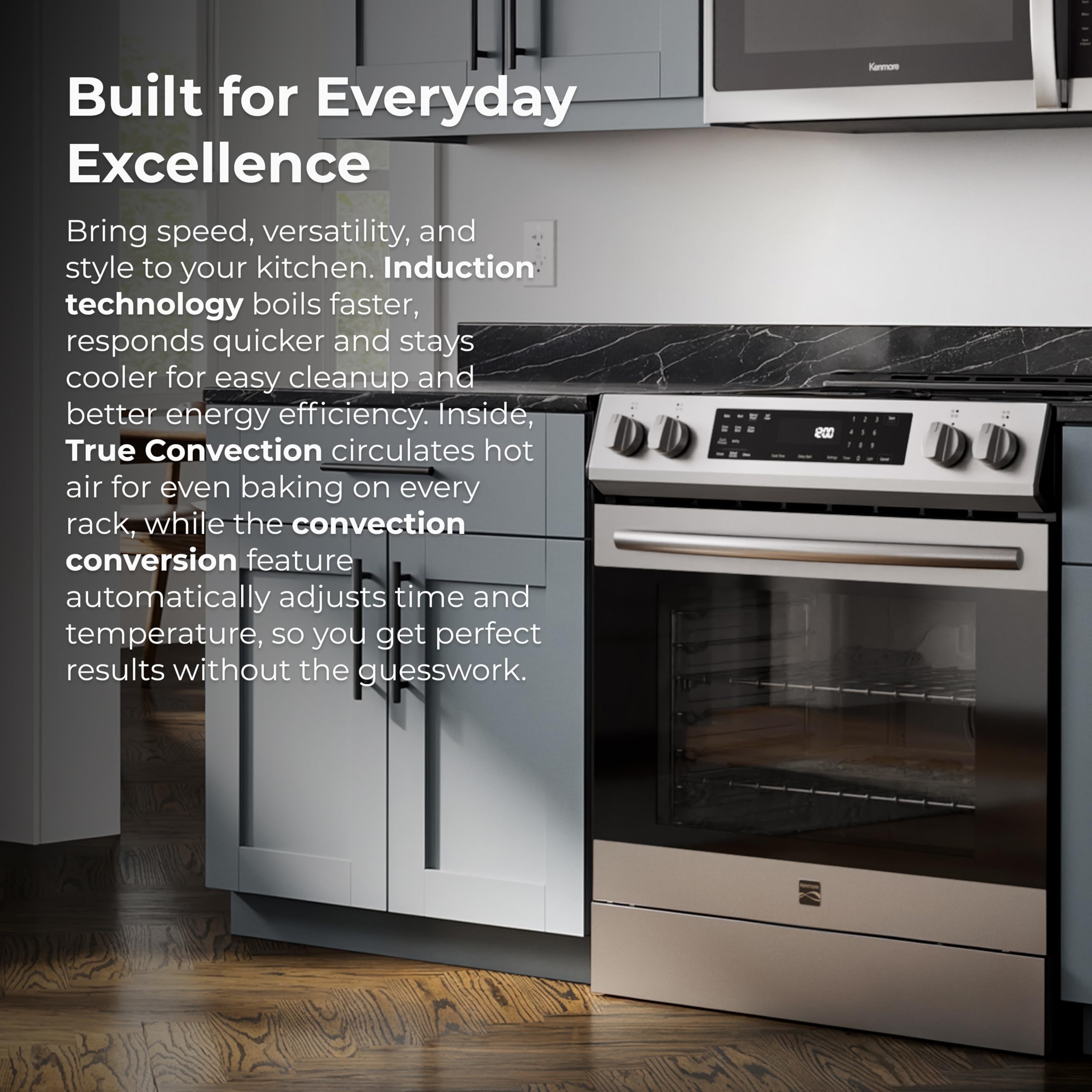 Discover the versatility and smart design of the Kenmore 5.6 cu. ft. Front Control Electric Induction Range Oven, crafted to meet the demands of passionate home cooks and busy families alike. Induction elements provide rapid, responsive heat for precise culinary results, boiling water in record time compared to conventional gas and electric ranges. The oven’s generous capacity features True Convection and convection conversion for consistently even cooking, along with a dedicated air fry basket to create crispy favorites with minimal oil. Maintenance is simple with a self-cleaning system, hidden bake element, and robust chrome racks built for frequent use. Front-mounted precision controls and an integrated temperature probe deliver accurate performance, while thoughtful features like a large viewing window, bright halogen lighting, storage drawer, and four dual-ring elements combine form and function. This induction range oven offers a reliable, stylish solution for modern kitchens where performance and convenience are essential.