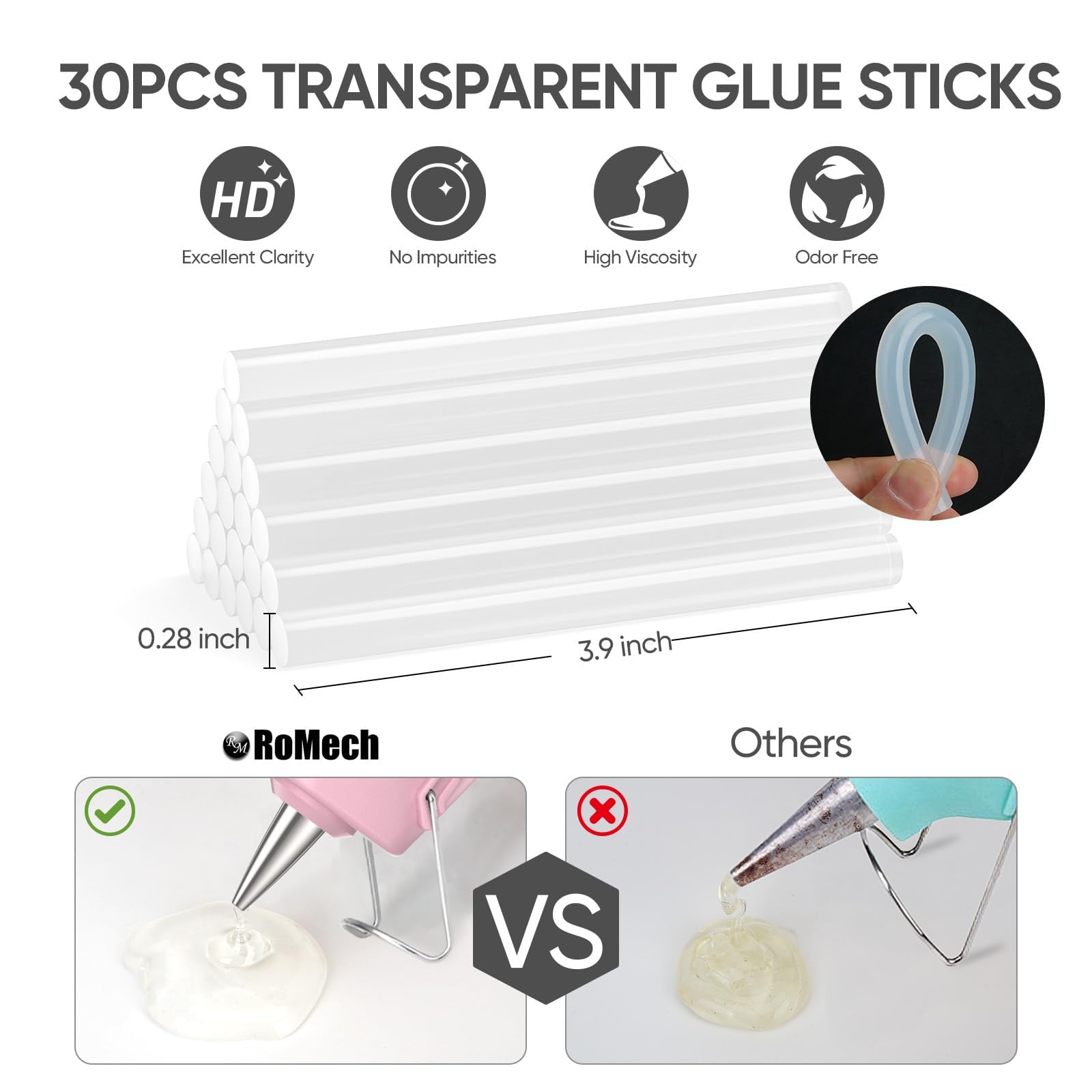 [RAPID HEATING & SAFETY] ROMECH Mini glue gun offers quick preheating in just 2-3 minutes and comes bundled with 30 glue sticks (0.28"/7mm diameter), providing an ample supply for your instant crafting or repair needs. The CE-certified hot glue gun has a built-in security fuse that prevents overheating and ensures safe use.
