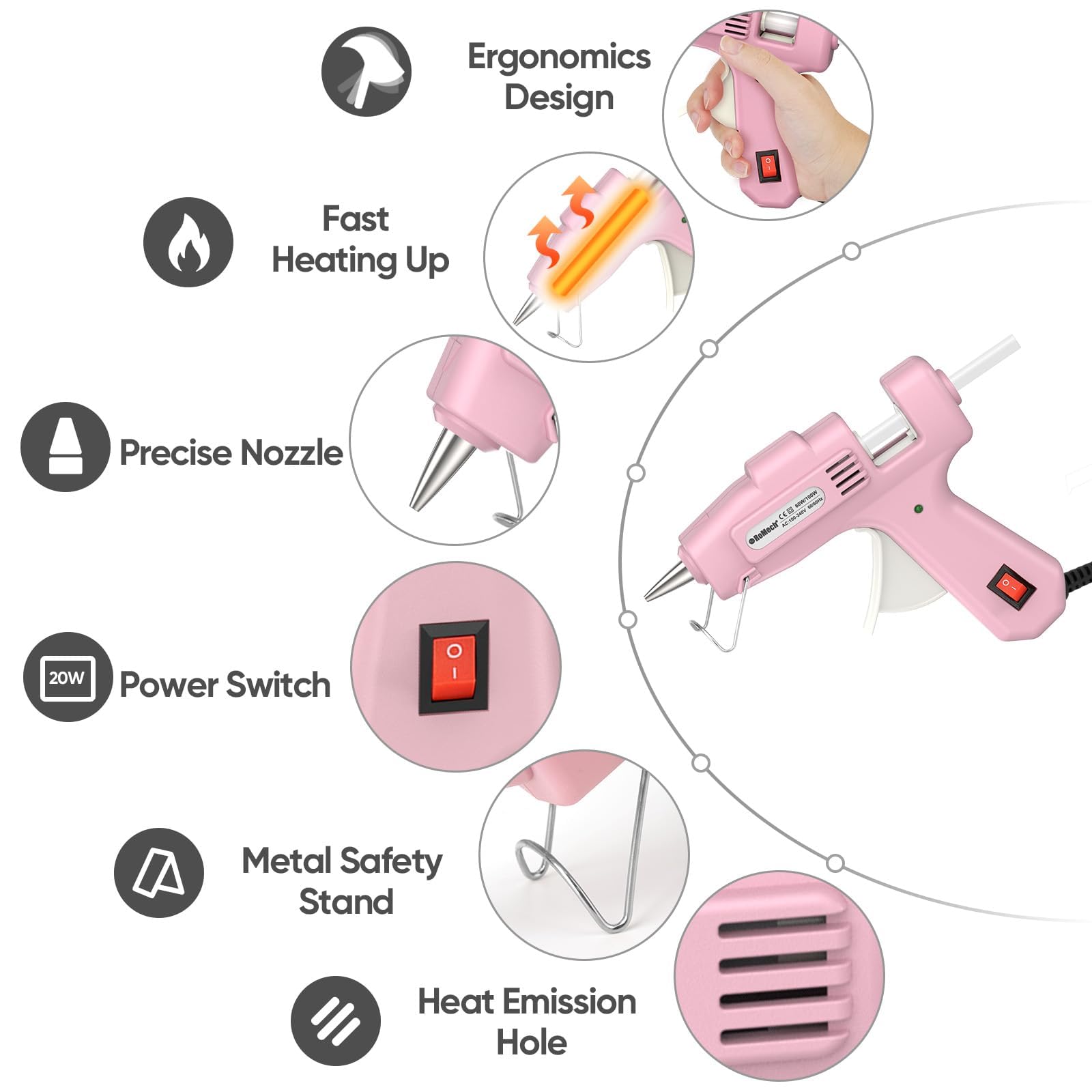 [EASY TO USE] The handle is ergonomically designed to ensure comfort even during extended use. The operation is very simple, just insert the glue stick into the hot glue gun, gently press the trigger to preheat for 2-3 minutes, and then release the melted glue. Start your DIY now!