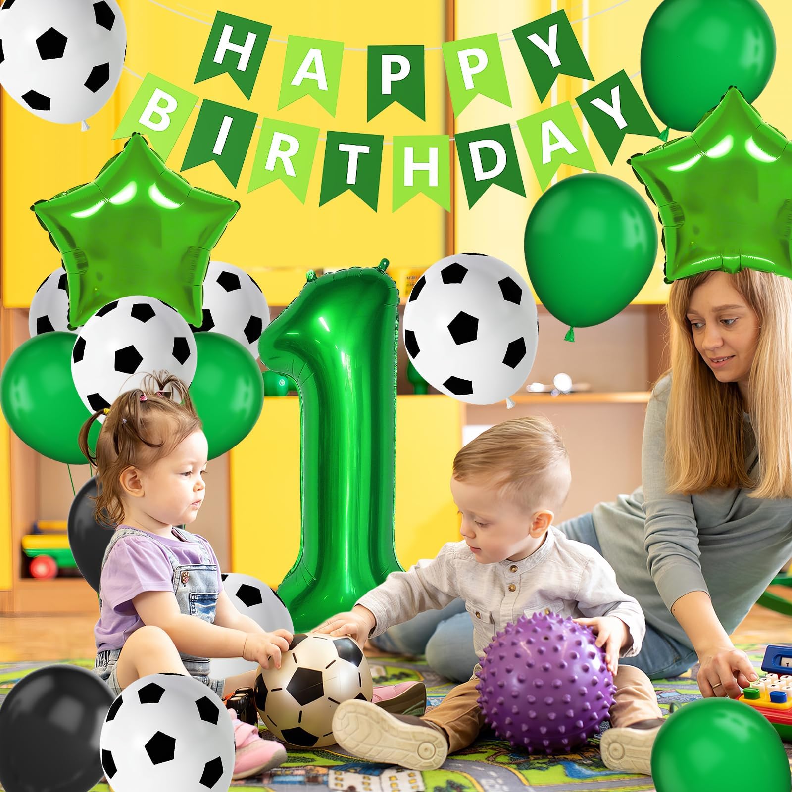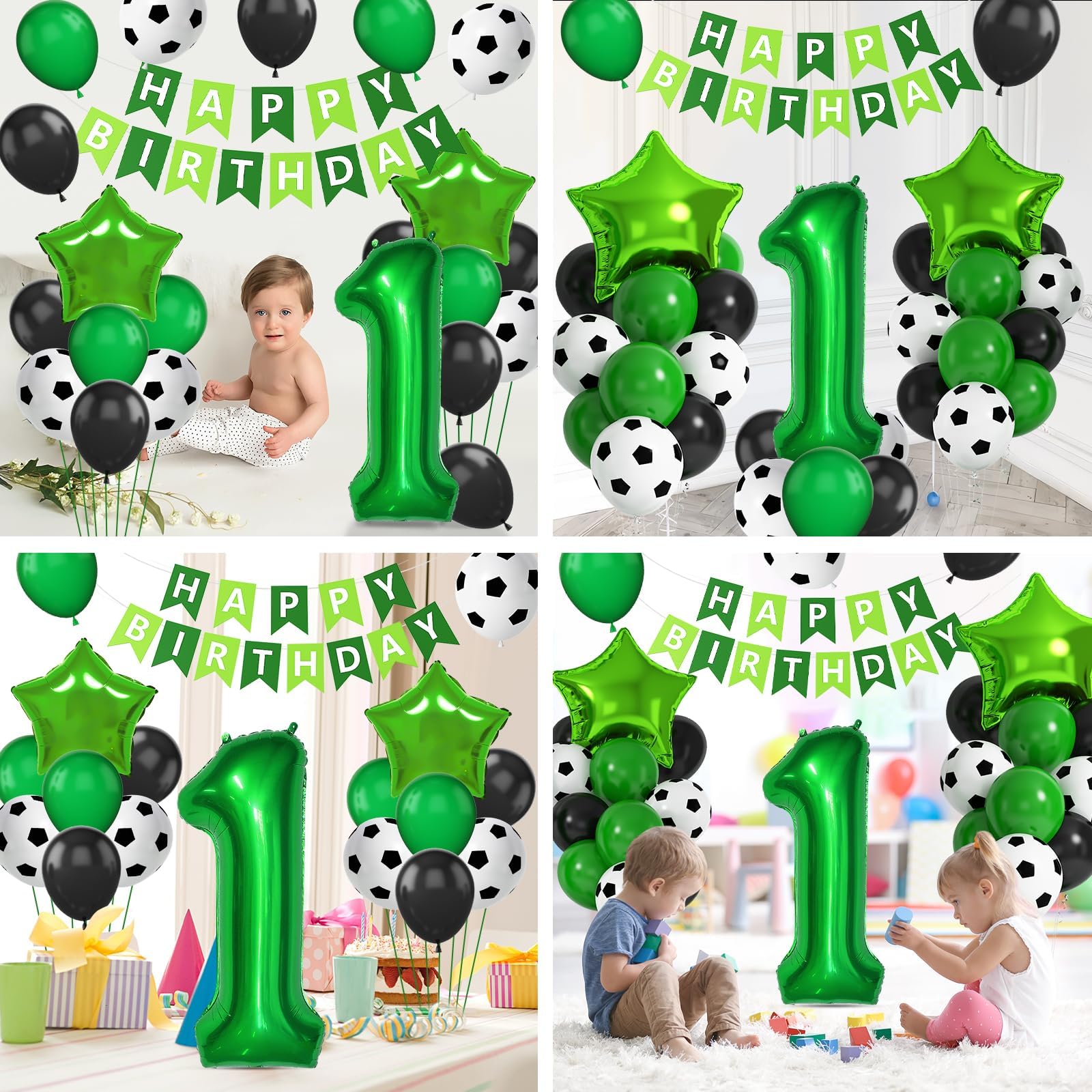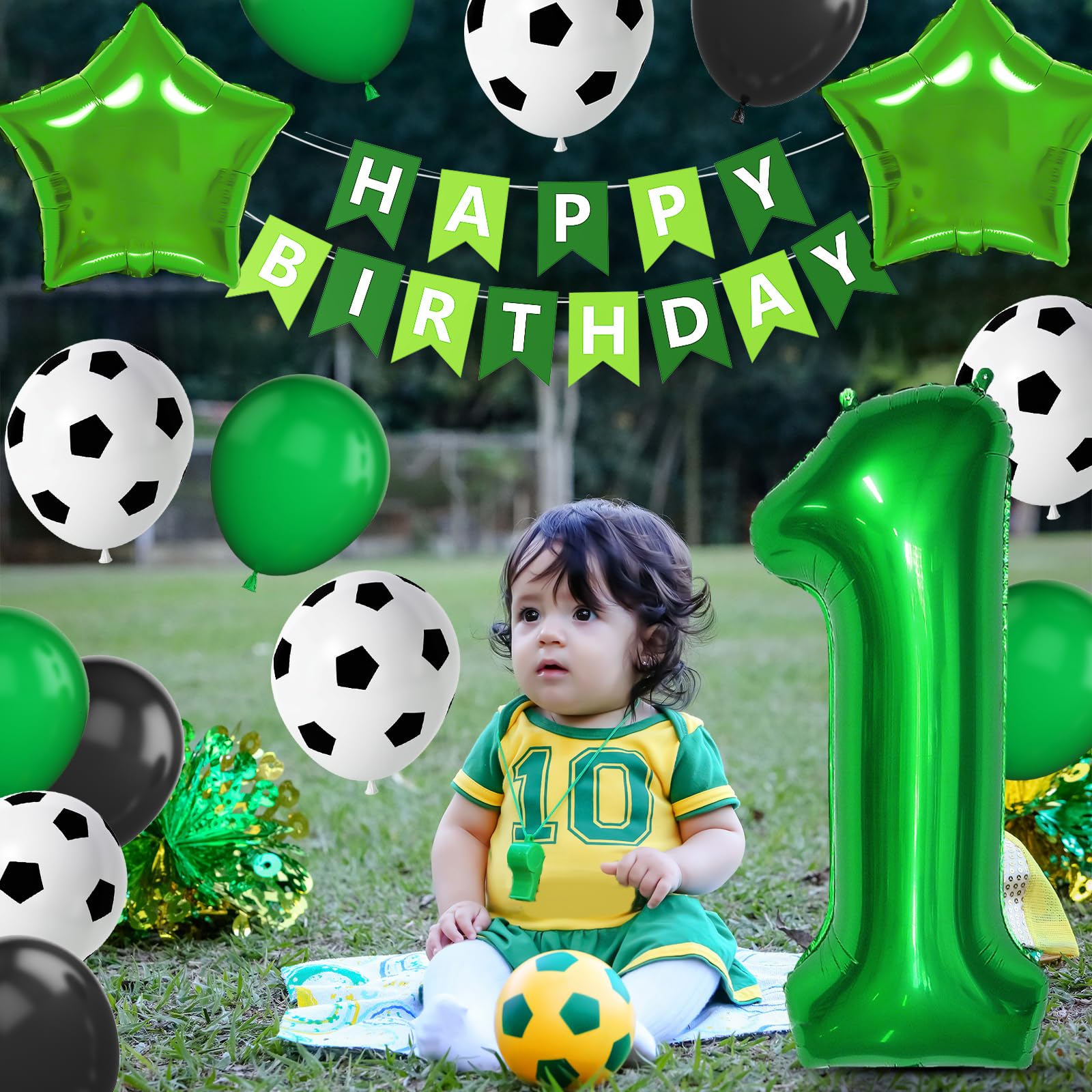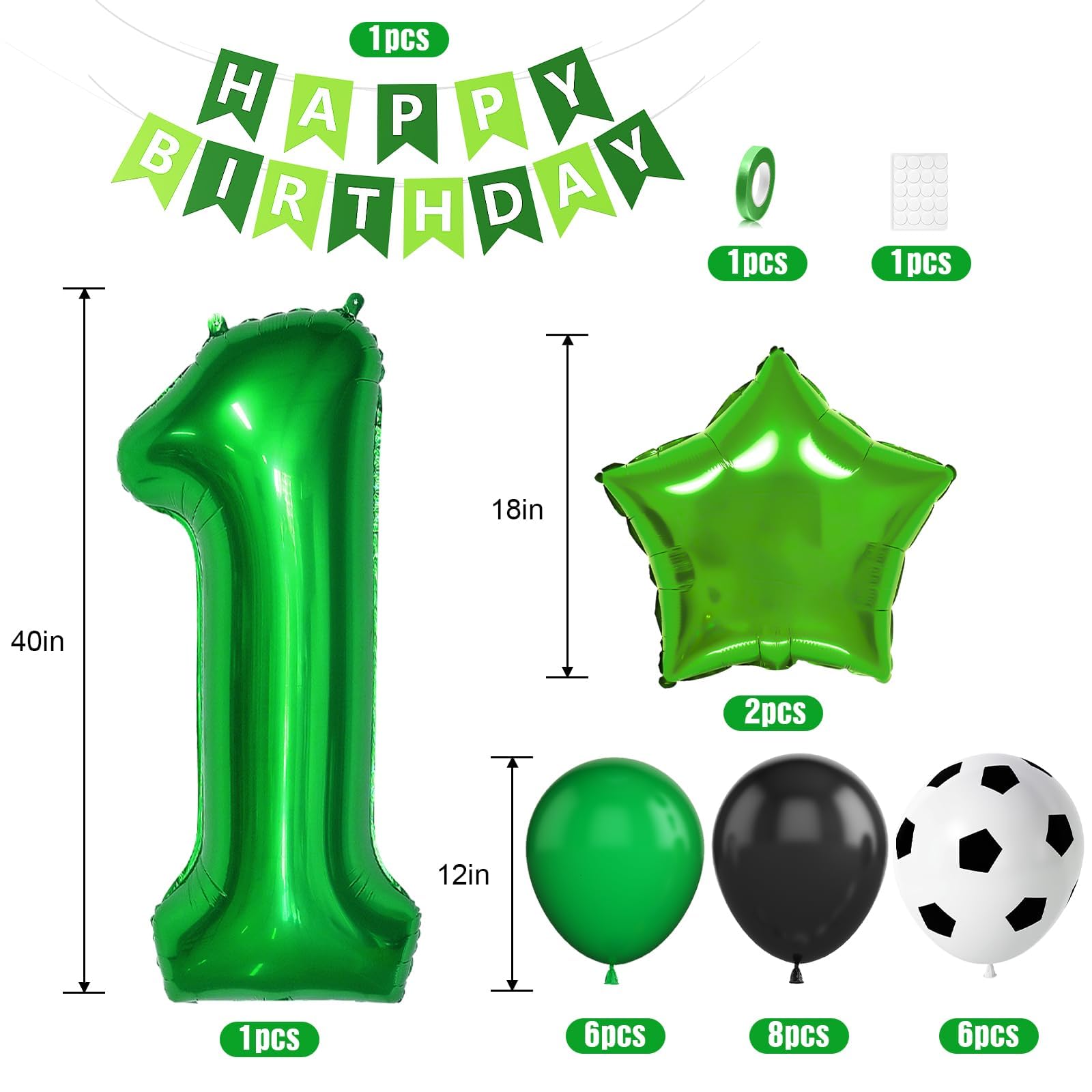 Soccer 1st Birthday Decorations: You will get 1 x green HAPPY BIRTHDAY banner, 1 x 40 inch number 1 foil balloon, 2 x 18 inch green star foil balloons, 20 x 12 inch balloons (green x 6, black x 8, soccer printed x 6), 1 x green ribbon, Soccer balloons can match your wonderful party theme. The color combination meets all your party imagination.