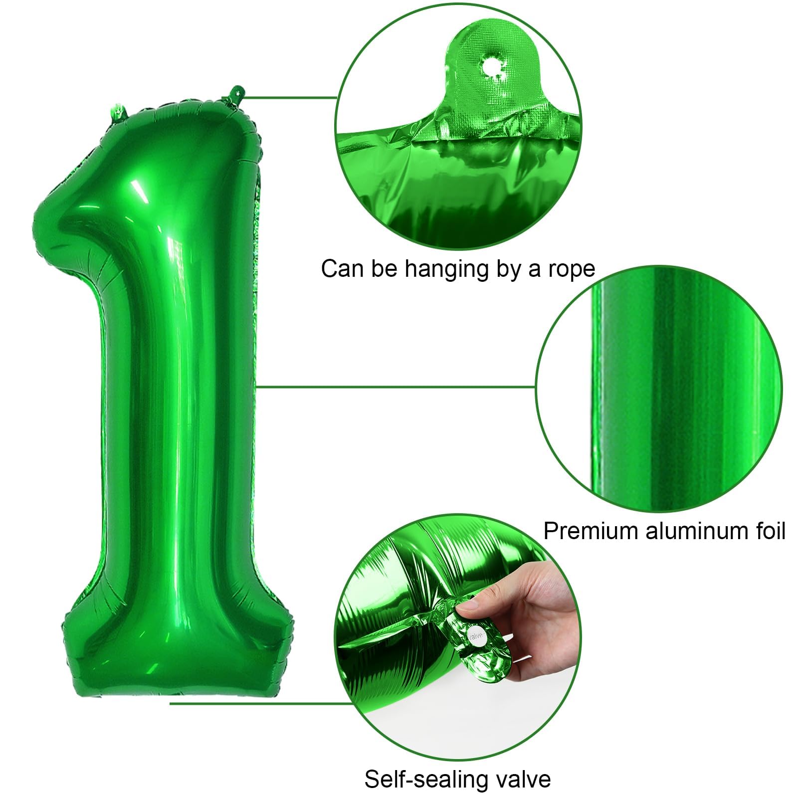 Easy to Use: The green number 1 foil balloons have self-sealing valve does not need to be knotted for easy inflation and deflation. It can be inflated with air or helium. When filled with helium, one year old birthday helium balloons can float in the air. After the party you can use a straw to slowly deflate the green number balloons and fold them neatly for next time use.
