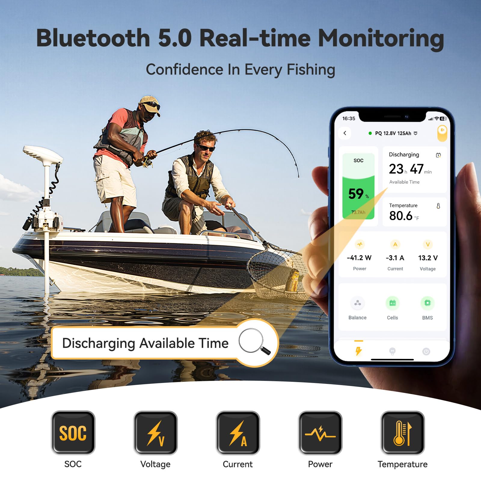 Bluetooth 5.0 Monitoring: scan the top QR code to pair fast and view SOC, voltage, current, power, temp, alerts and protection status - no more guessing your remaining runtime